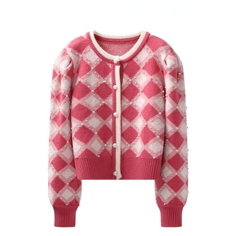 のみくまビーズコントラストカラーアーガイルニットレディースカーディガン長袖Oネック2022セーターコート ロング kor64664426193