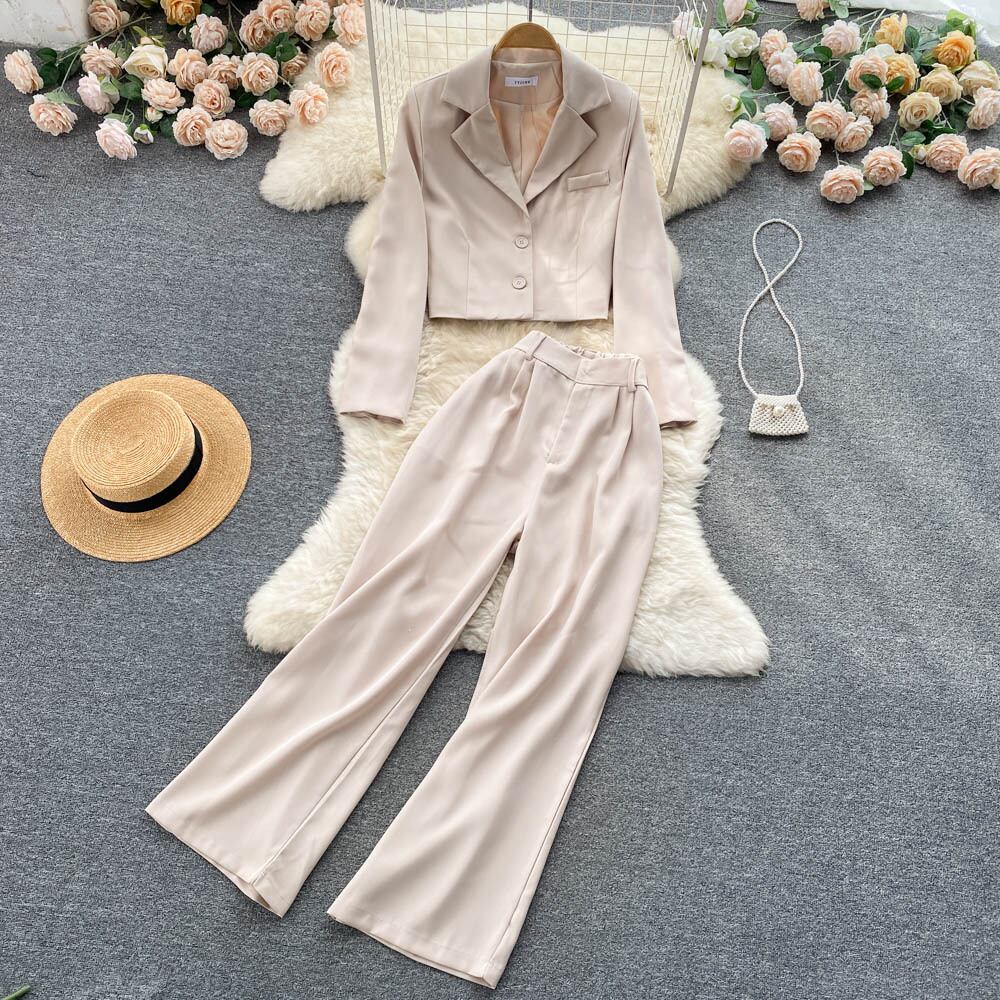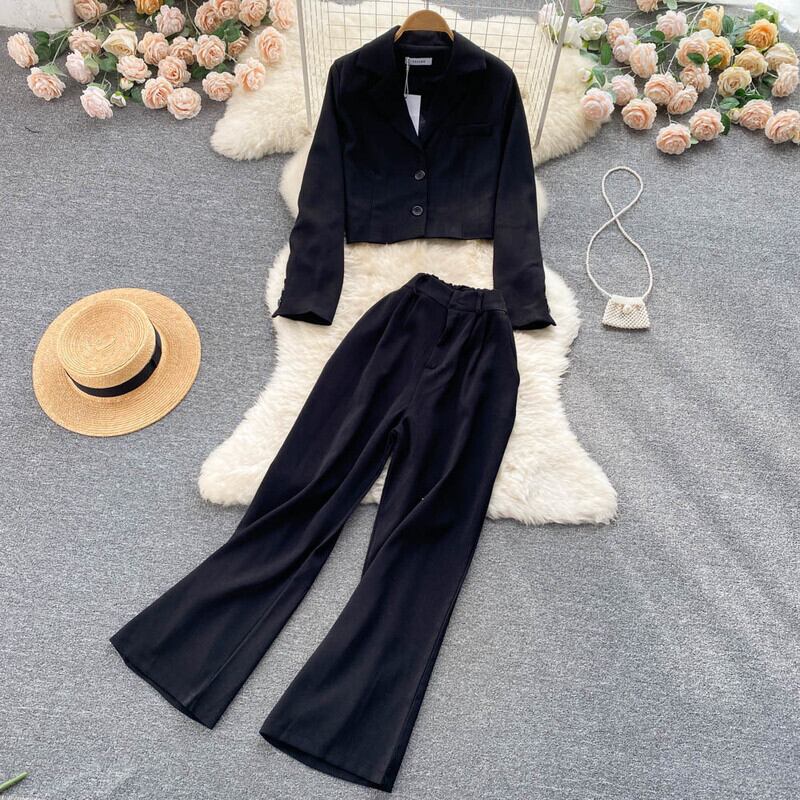 のみくま因果スーツセット女性秋長袖ノッチカラーショートブレザー+ウエストワイドレッグロングパンツ オータム 秋物 ワイドパンツ kor3896676878