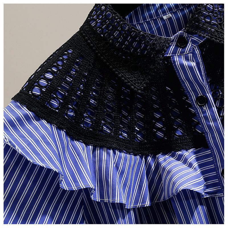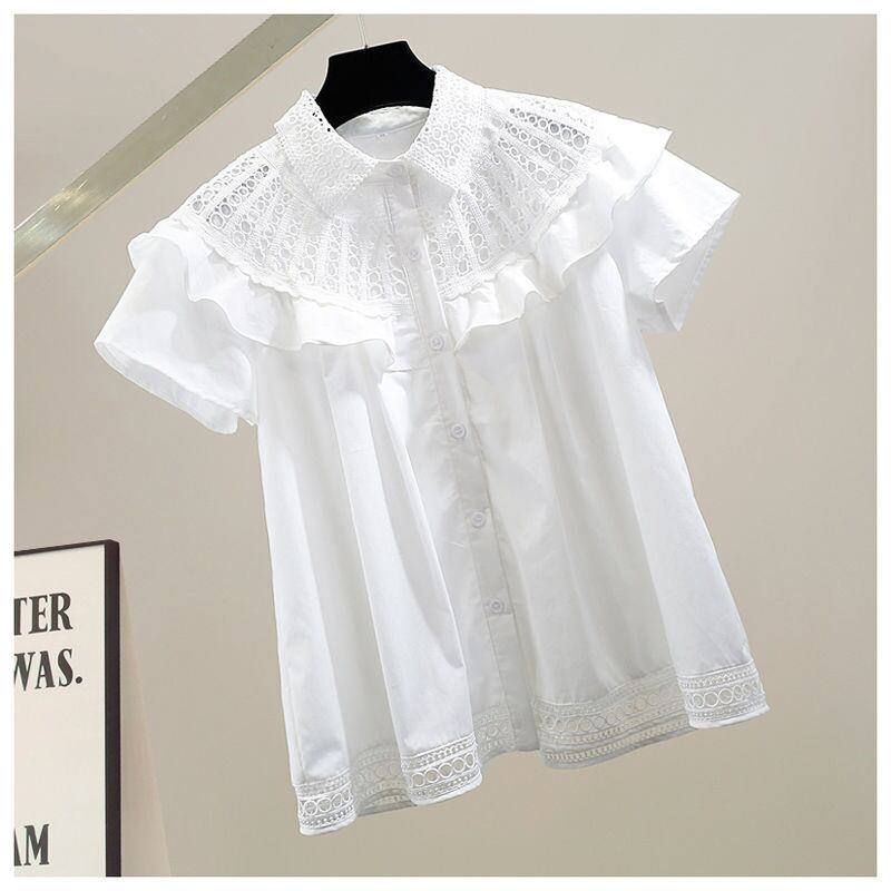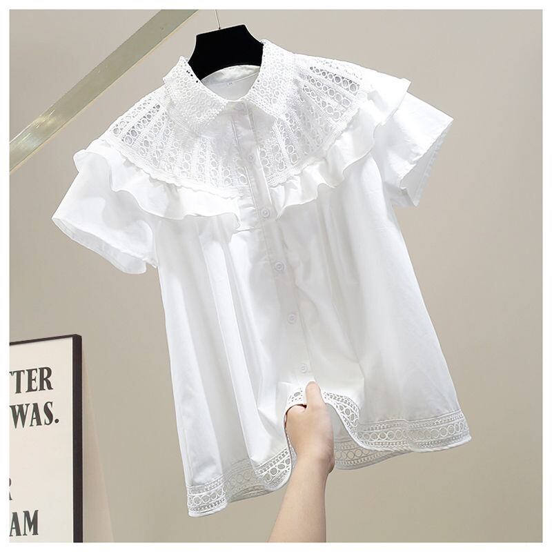 のみくまレースヒットカラーパッチワークフリルストライプブラウス因果半袖2022サマーシャツ ショート ハーフスリーブ 夏物 kor21164131733