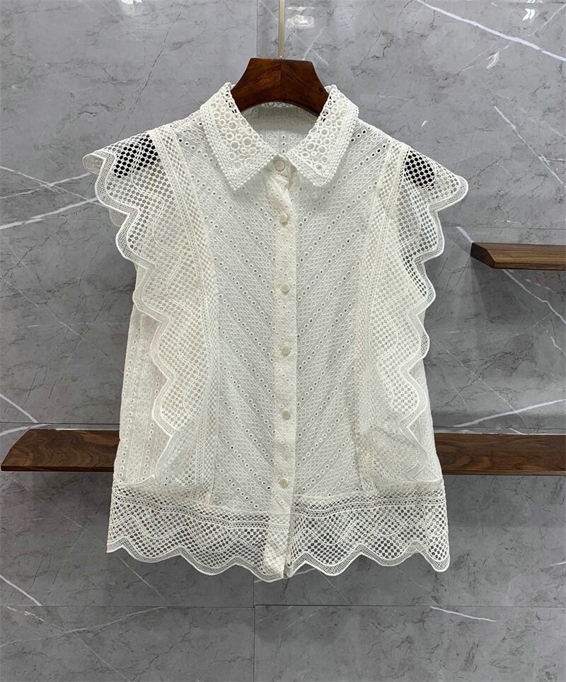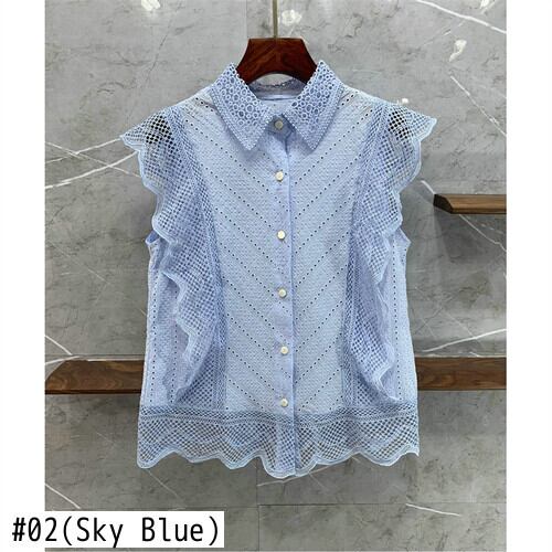 のみくまレースくり抜きパッチワークフリルノースリーブブラウス女性2022トップスシングルブレストシャツ kor83389809750