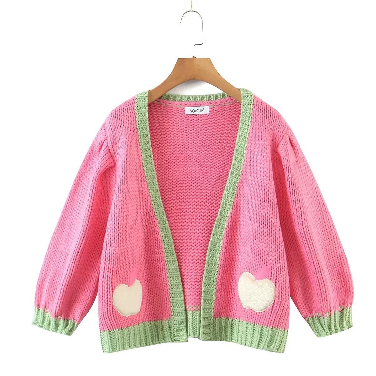 のみくまロングランタンスリーブCardiagnCoatWomen 2022 Autumn Cartoon Jacquard Sweater V-neck Short Open Stitch ショート オータム 秋物 Vネック ステッチ kor41196954645