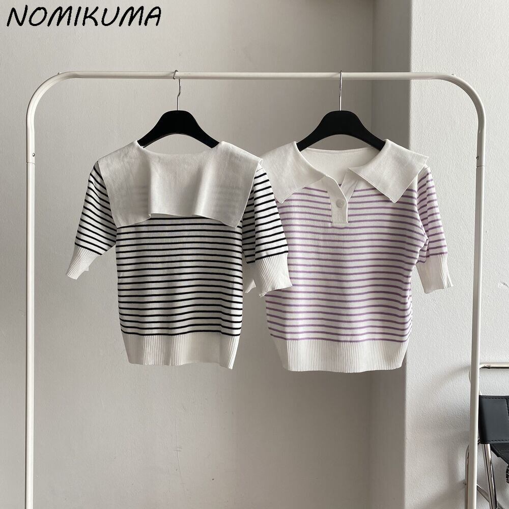 ノミクマヒットカラーストライププルオーバーニットカジュアル半袖ターンダウンカラーセーターレディース2022サマーニットトップス ショート ハーフスリーブ 夏物 kor68091265620