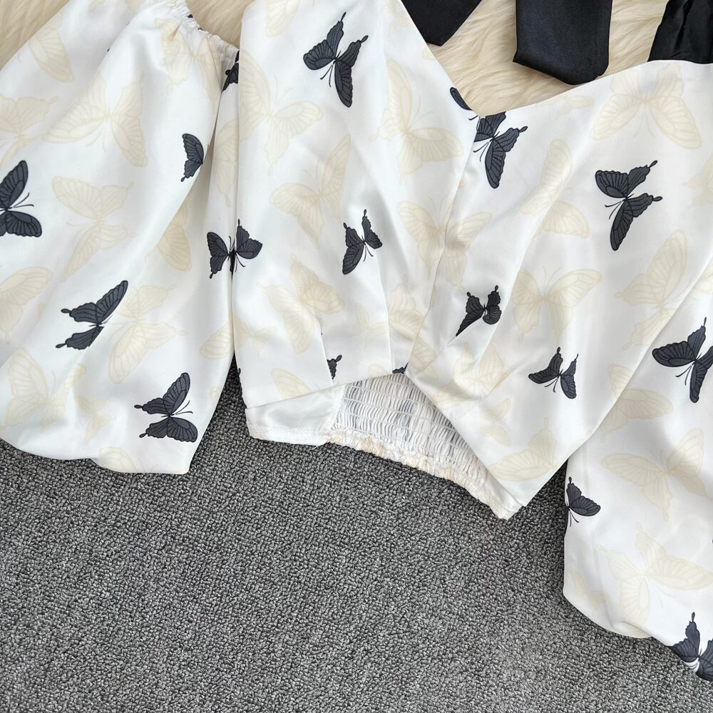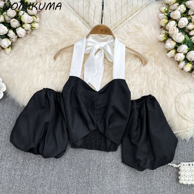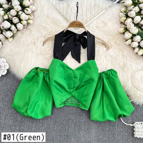 のみくまスラッシュネックボウバンデージホルターブラウス女性ヒットカラーパフスリーブシャツ2022夏セクシーバックレスストラップレスクロップトップス リボン サマー 夏物 kor7734094638