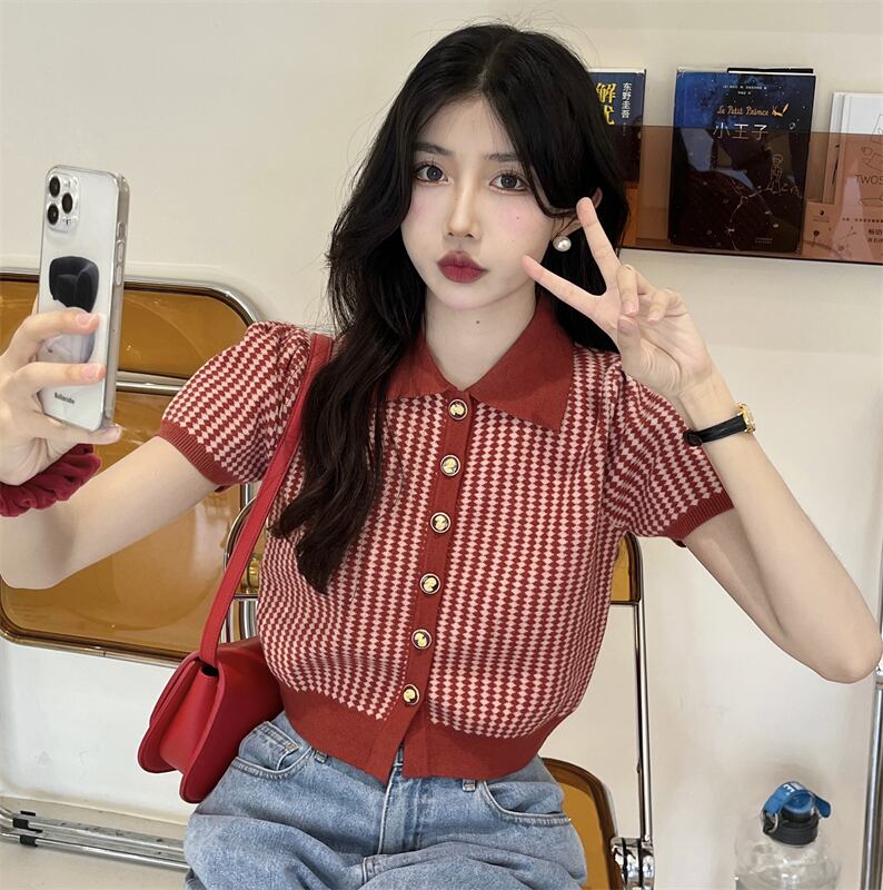 ノミクマアーガイルショートニットトップスターンダウンカラーパフスリーブセーターコート2022スウィートウーマンニットカーディガン 大人ガーリー キュート カジュアル kor76312823775