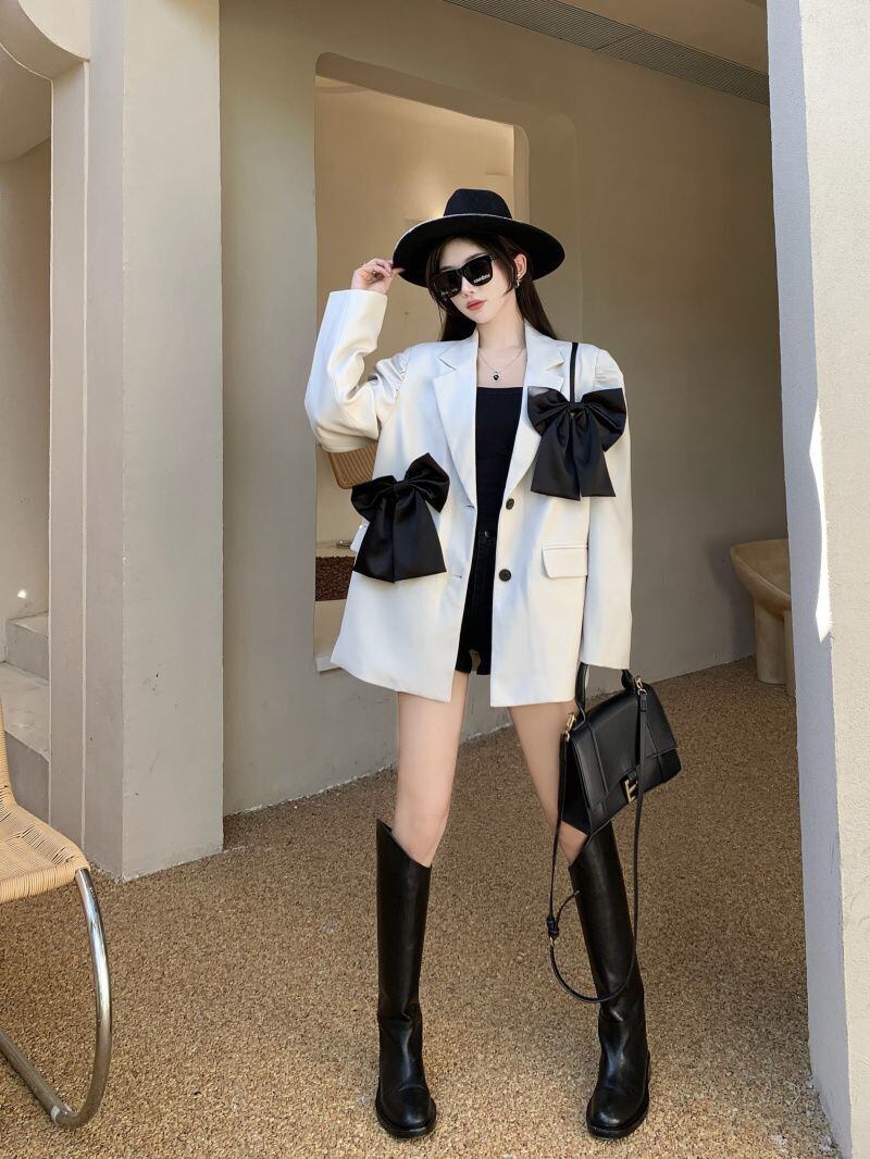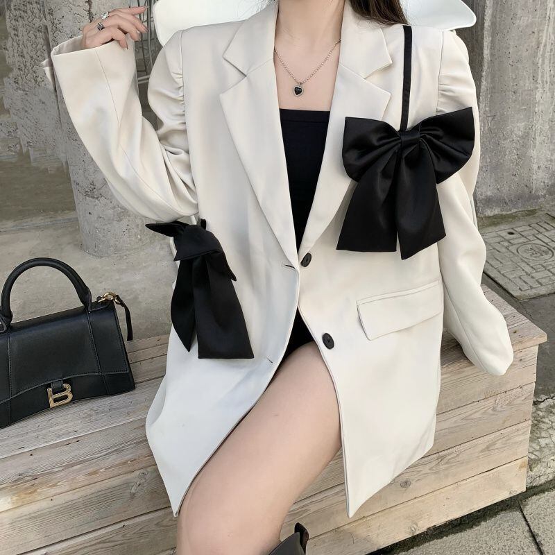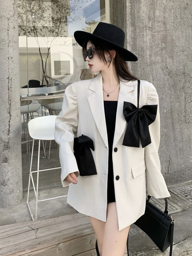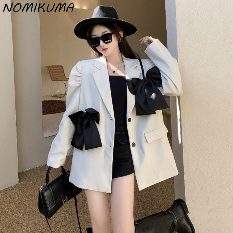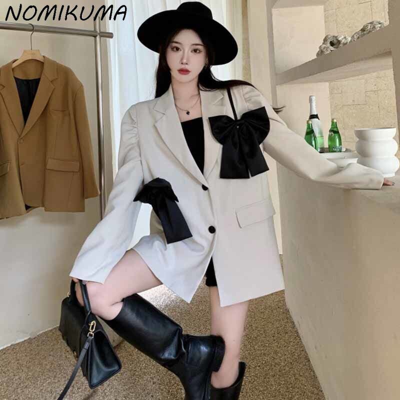 ノミクマミディアムロングスーツジャケットスウィートボウノットターンダウンカラーブレザー2022オータムブレザーコート リボン 大人ガーリー キュート カジュアル 秋物 kor38862040977