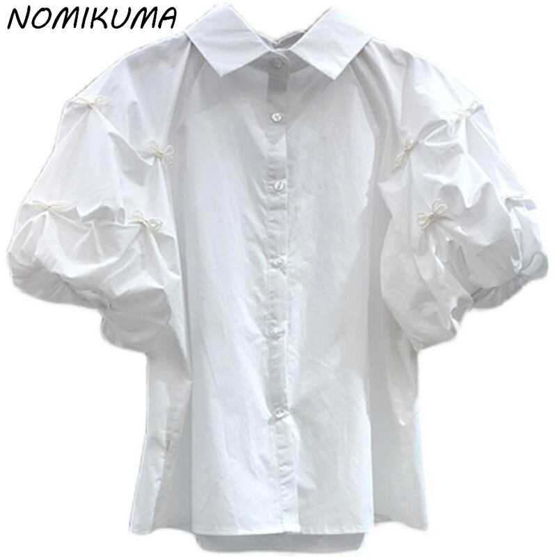 ノミクマシックビーズボウノットパフスリーブブラウスレディース2022サマーソリッドターンダウンカラーシャツ リボン 夏物 ソリッドカラー kor41489332177