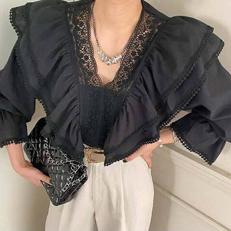のみくまVネックパッチワークレースシャツレディースオータムフリルシックトップスCausal2022長袖プルオーバーブラウス ロング 秋物 kor15580206842