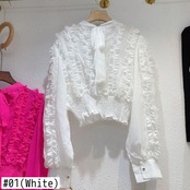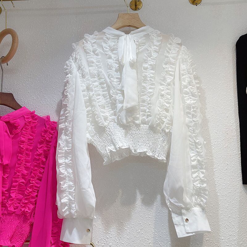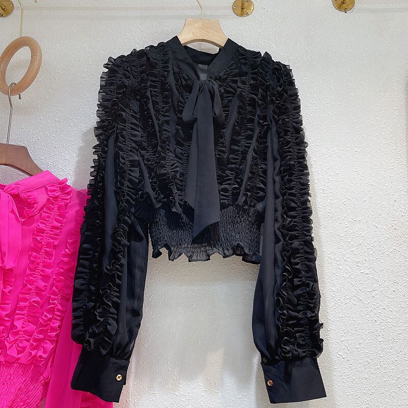 のみくまシフォンブラウス2022AuutmnボウバンデージOネックショートプルオーバートップスシックフリルパッチワークシャツ リボン kor42461761417