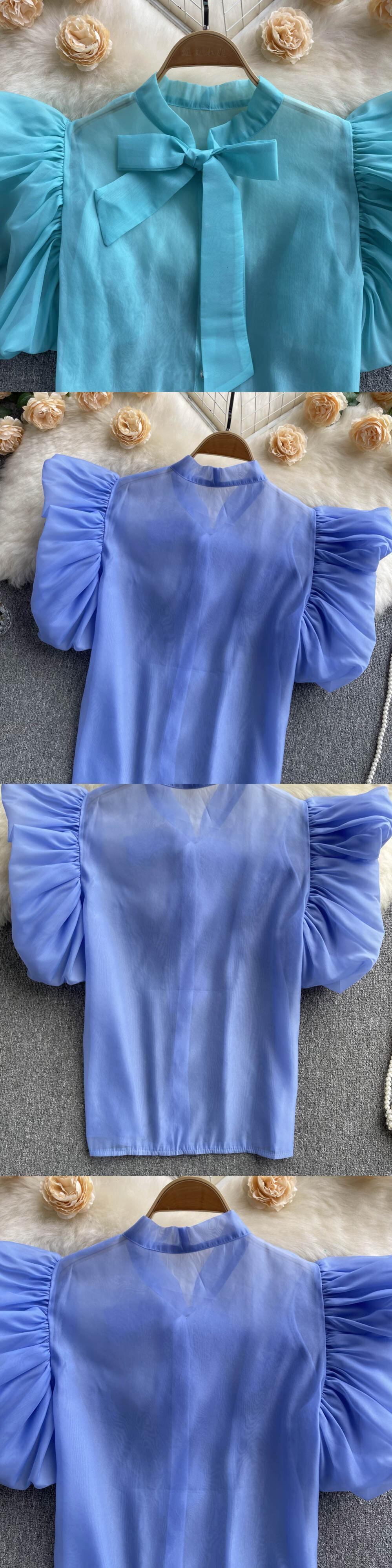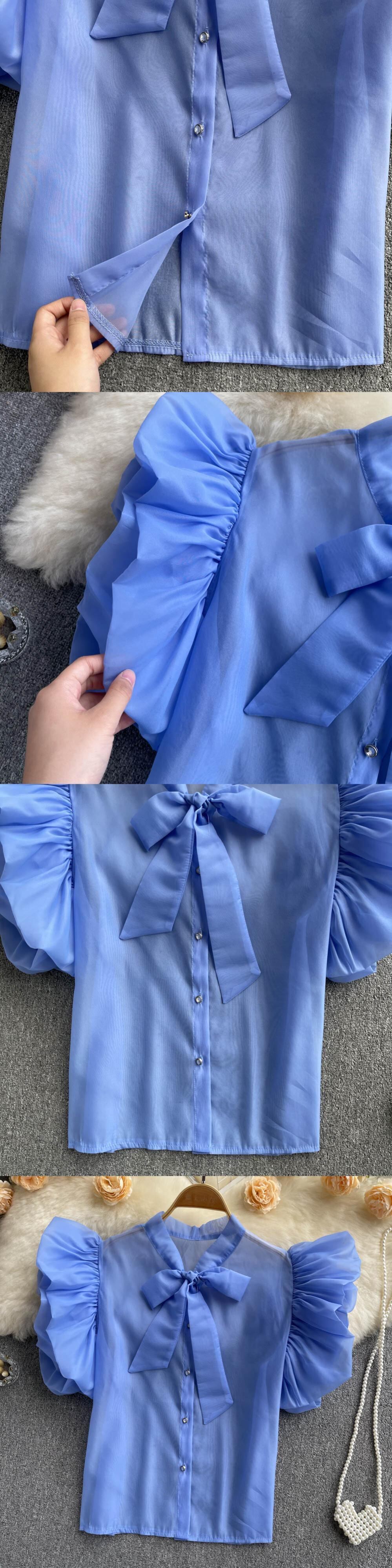 のみくまシックフライングスリーブブラウスシャツスウィートボウ包帯因果レディーストップ2022サマーデモダ リボン 大人ガーリー キュート カジュアル 夏物 kor33753027505