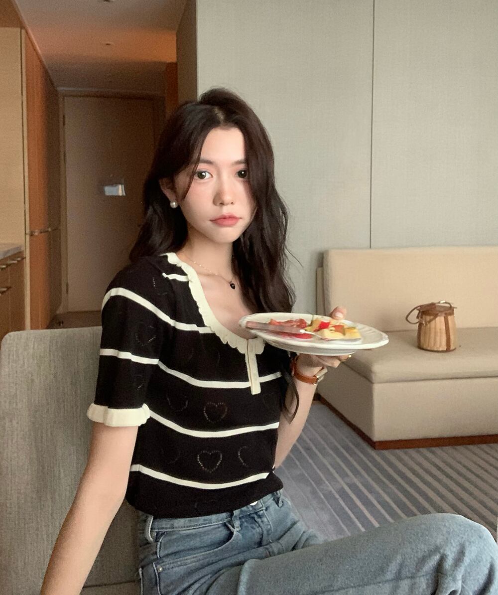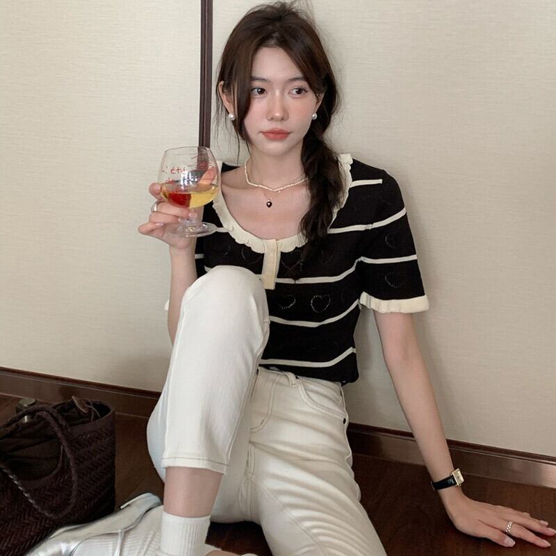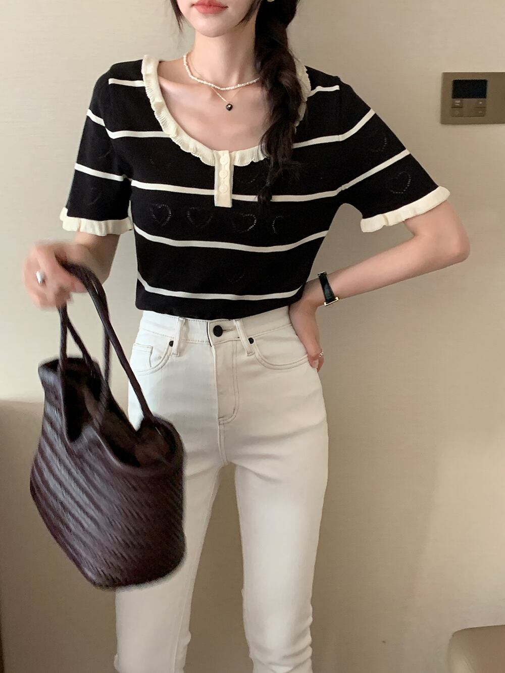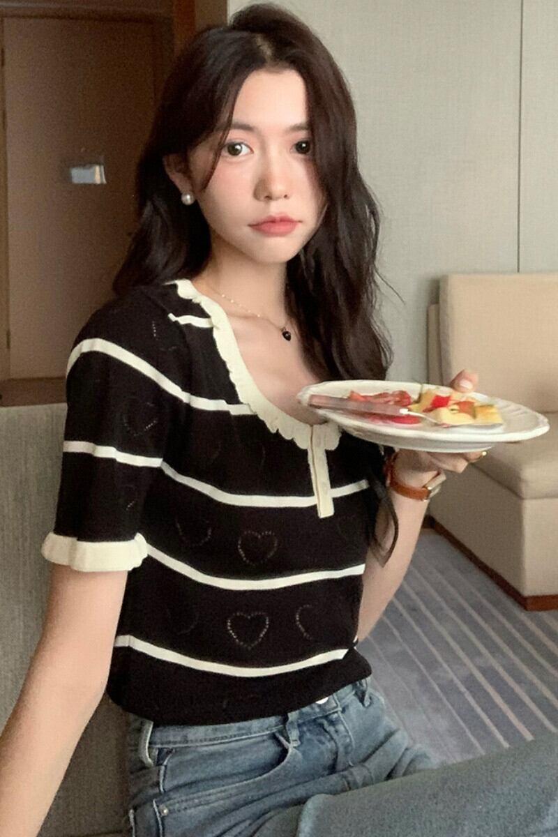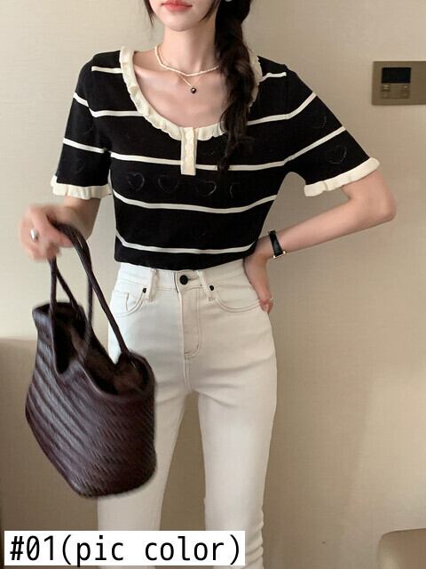 のみくまくり抜きラブハートニットフリルOネックトップス因果半袖2022夏ニットセーターセーター ショート ハーフスリーブ サマー 夏物 kor22789468176