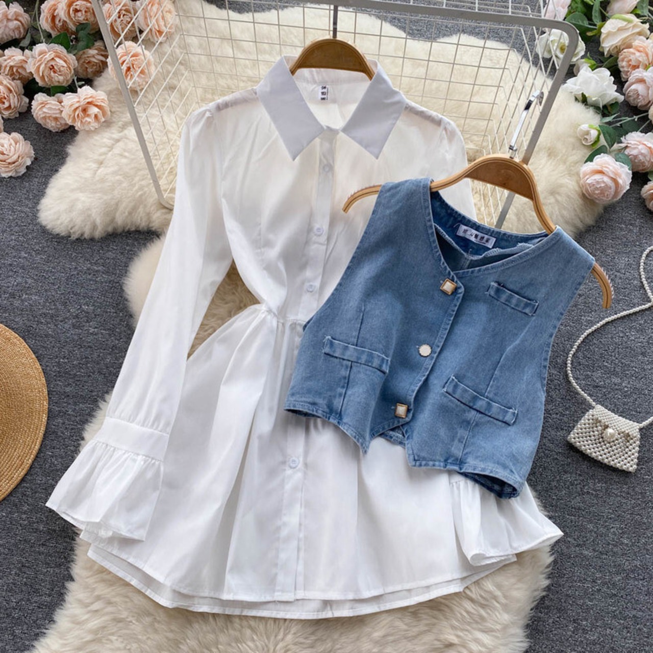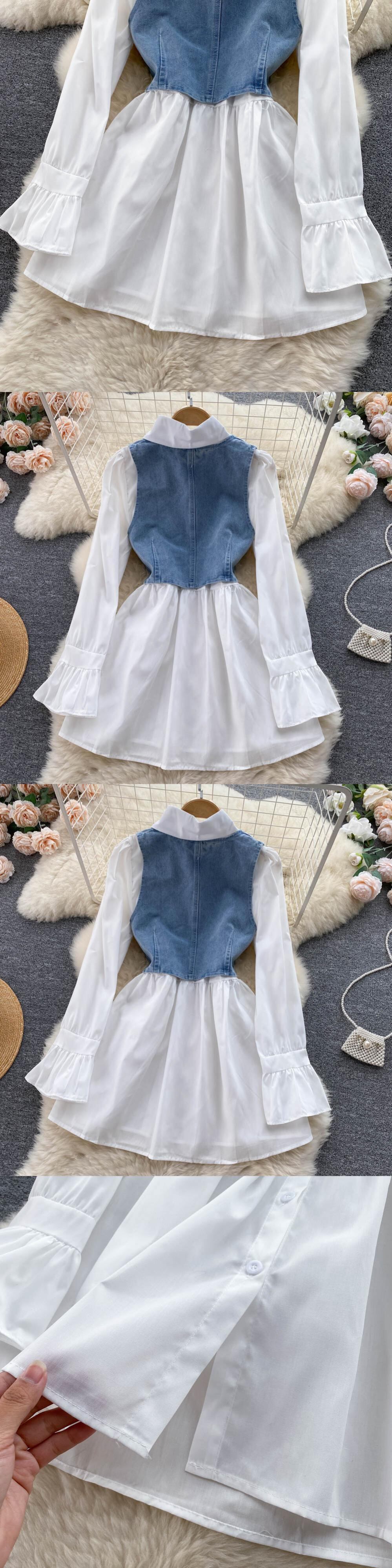 KUSAHIKI2点セットレディース衣装長袖シングルブレストブラウスワンピース+Vネックショートデミンベスト2022秋 ロング オータム 秋物 kor40794410274