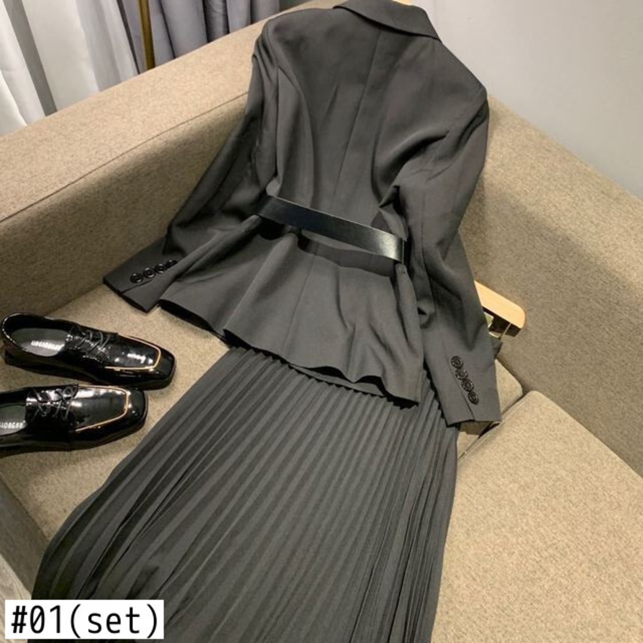 ノミクマブラックブレザーベルト付き+ミディプリーツスカートレディース2点セットオータムレディロングスリーブスーツジャケットシックスカートスーツ 長袖 秋物 ハーネス kor12206949440