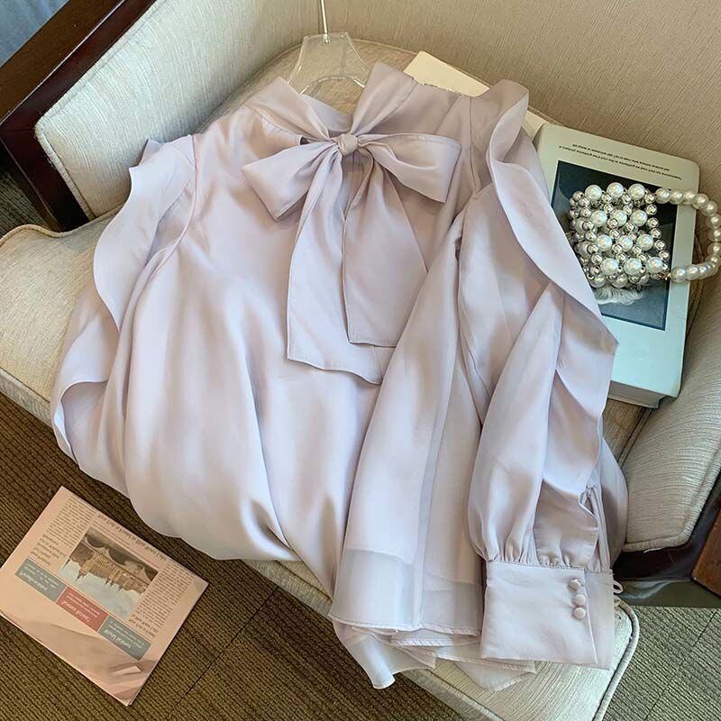 のみくまシックボウタイVネックフリルパッチワーク長袖ウーマンシャツ2022オータムブラウストップス ロング リボン 秋物 kor43873031683