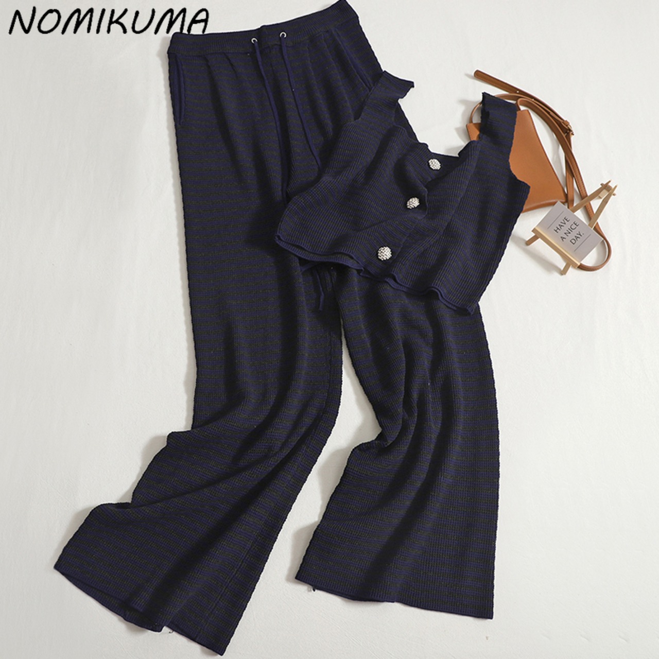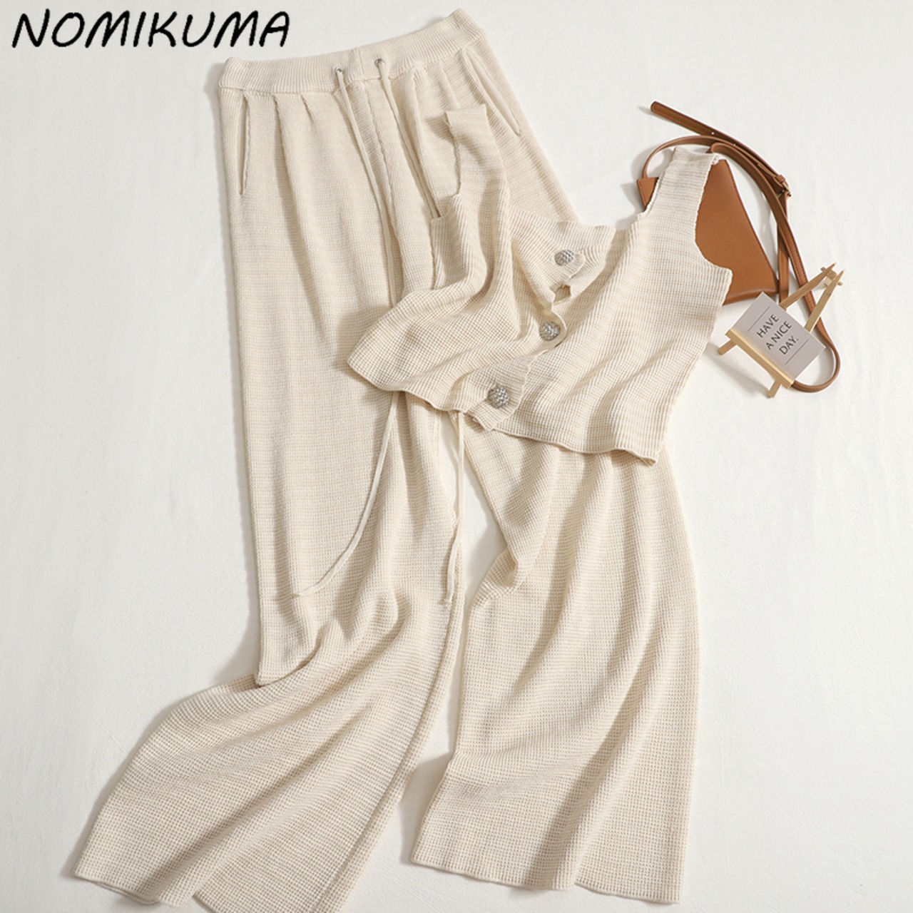 のみくま2ピースセットレディースサマーシングルブレストソリッドタンクトップ+レースアップウエストワイドレッグロングパンツ 夏物 ワイドパンツ ソリッドカラー kor3368465540