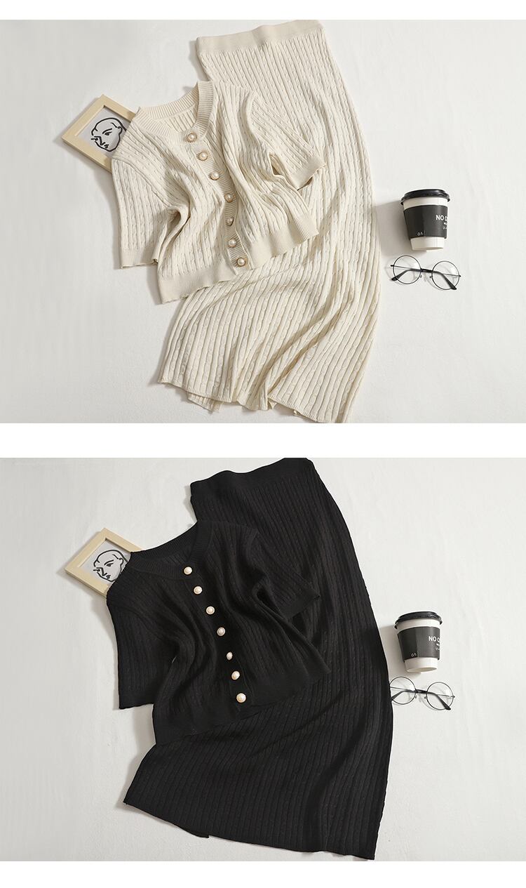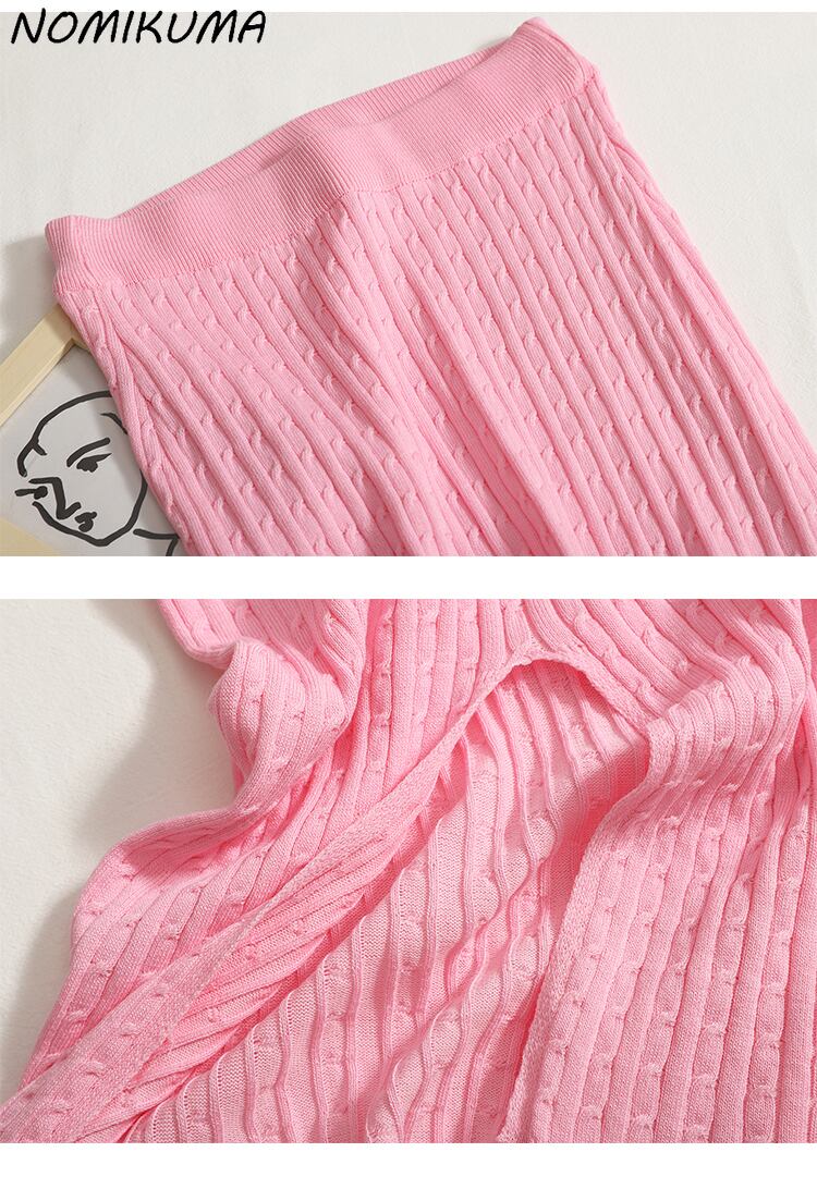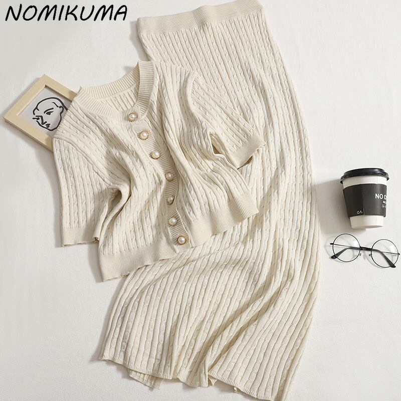 ノミクマ2022サマーニットツーピースセットソリッドシングルブレストOネックニットカーディガン+ウエストスプリットスカートスーツ 夏物 ソリッドカラー kor43533287244
