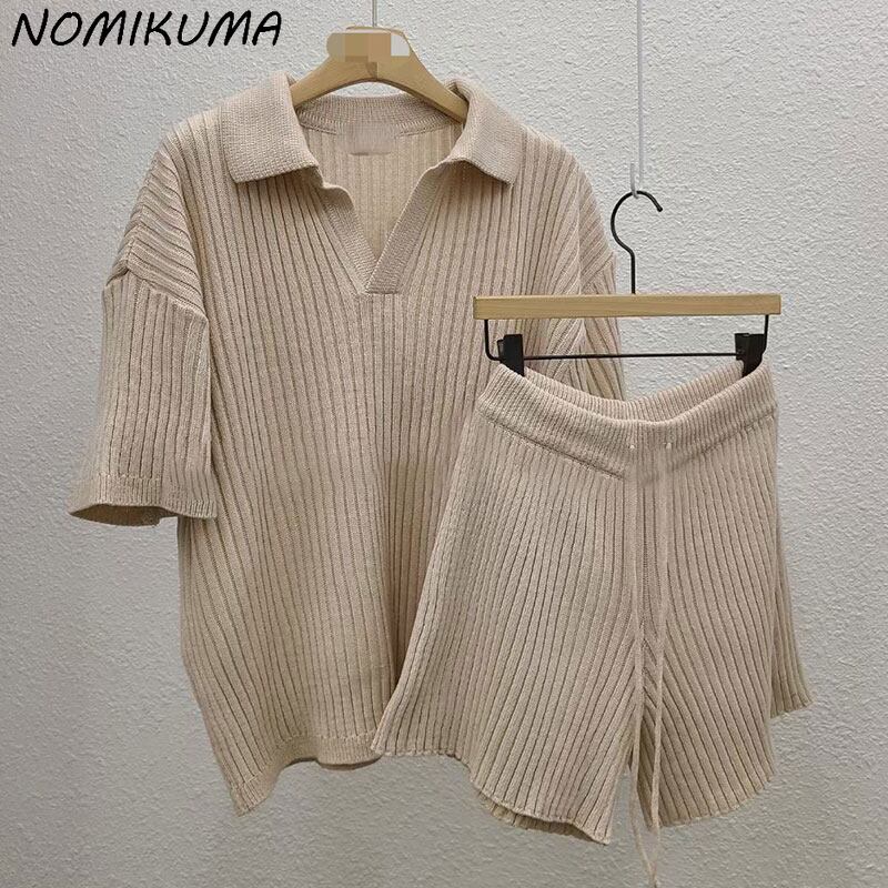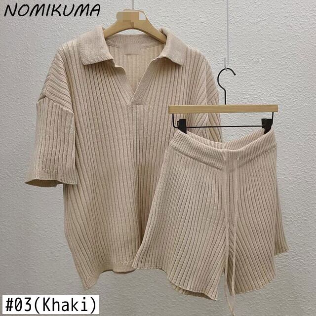 のみくまカジュアルニット2点セットショートLseeveターンダウンカラープルオーバーニット+レースアップウエストショーツ ブルマー kor18977942500
