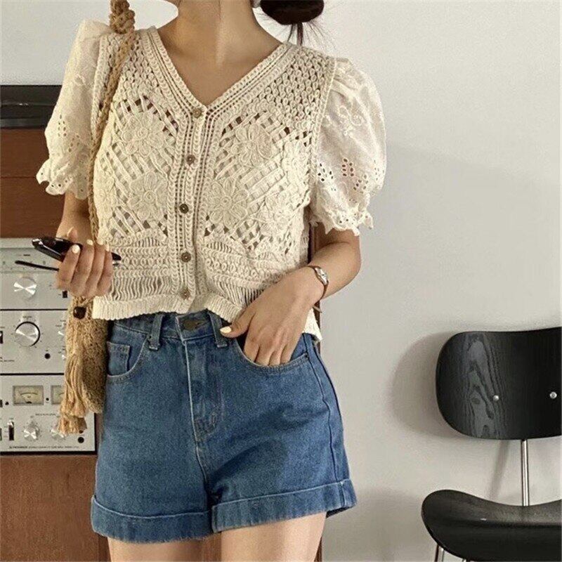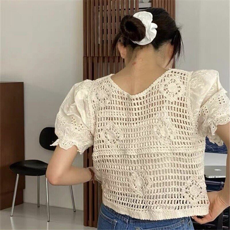ノミクマシックフックホローアウトショートニットカーディガンレースパッチワークパフスリーブニットウェアネックセーターコート kor54197427644