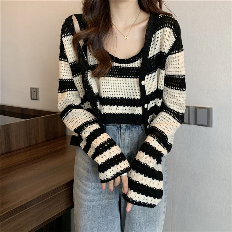 のみくまニットレディース2022秋ホローアウトストライプカーディガンこのスリングベストツーピースショートニットトップスレディースセット オータム 秋物 kor4747328959