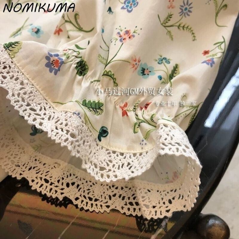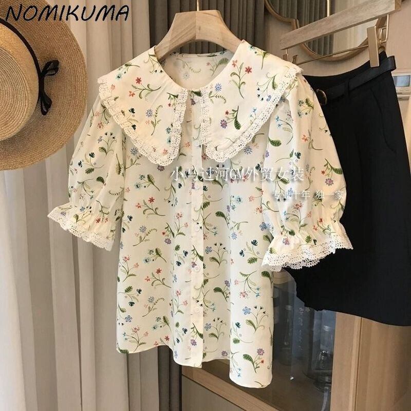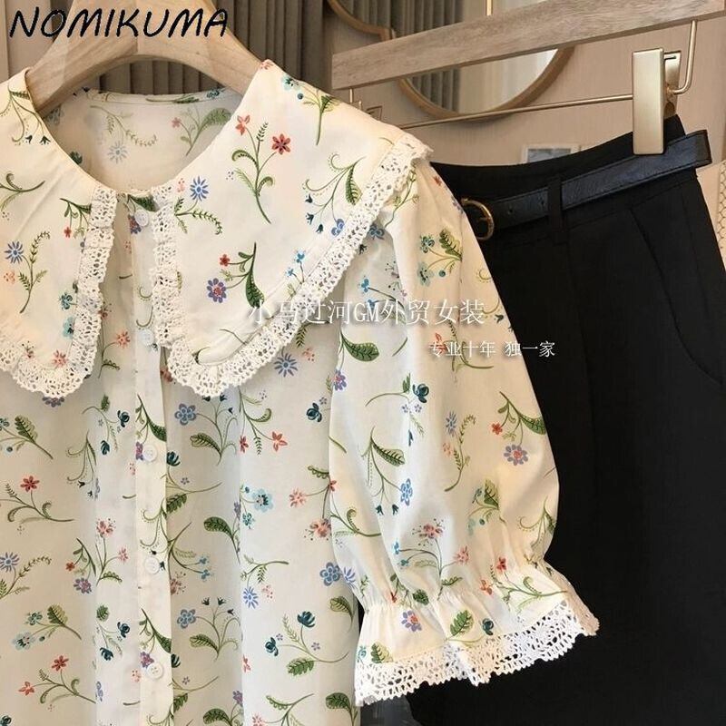 のみくまフローラルスウィートドールシャツシックピーターパンカラーパフスリーブブラウストップコーザルサマーデモダ2022 大人ガーリー キュート カジュアル 夏物 花柄 kor26931868423