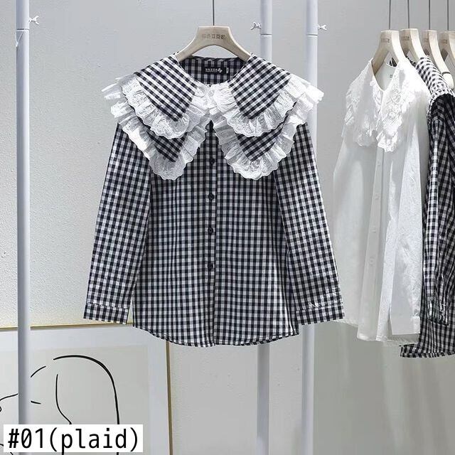 のみくまシックレースフリルパッチワークダブルピーターパンカラーブラウス2022長袖チェック柄シャツCausalDe ロング kor31068880560