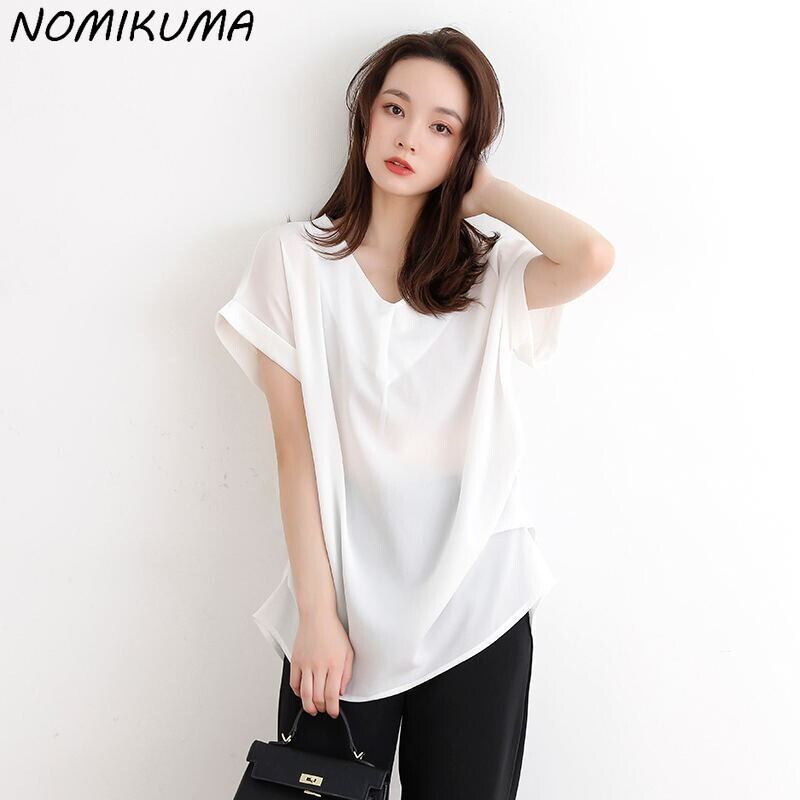 Nomikuma Style De Causal Back Folds Woman Shirt2022Sumemr半袖Vネックブラウストップス ショート ハーフスリーブ kor10994107532