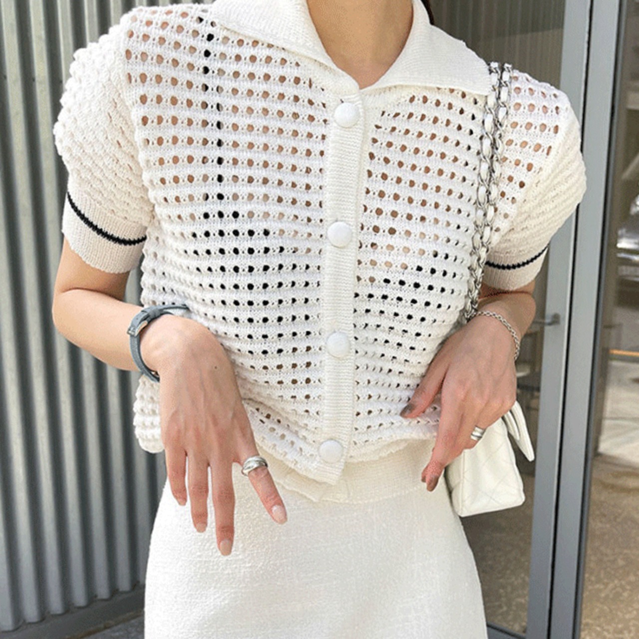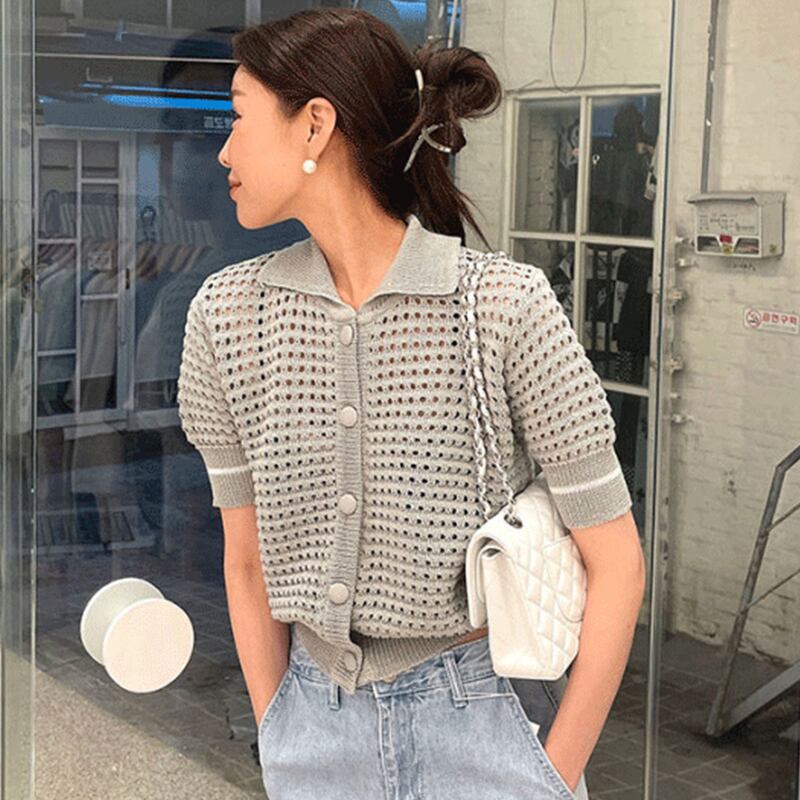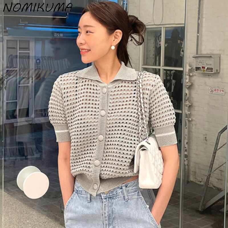 ノミクマターンダウンカラーホローアウトニットシック半袖シングルブレストカーディガン2022ニットコート ショート ハーフスリーブ kor54949073403