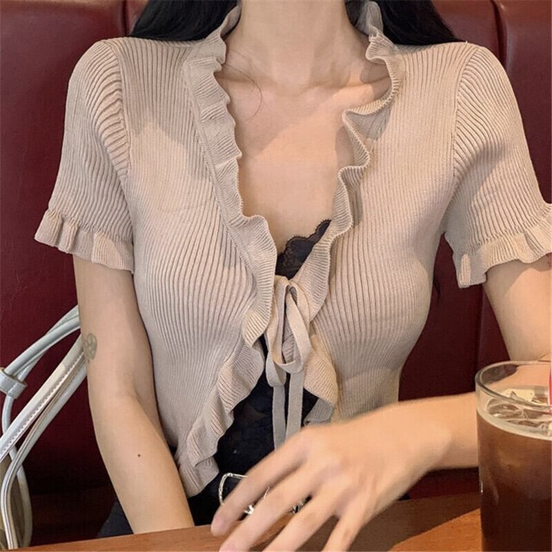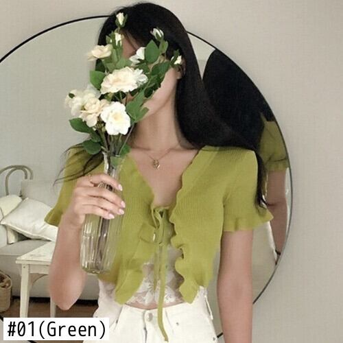 のみくまニット蝶ネクタイクロップドカーディガンレディースフリルスウィート半袖Vネックニットトップス2022サマーセーターコート ショート リボン ハーフスリーブ 大人ガーリー キュート カジュアル 夏物 kor93327867260