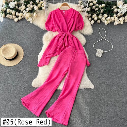 ノミクマシフォンセットレディース2022サマースーツイレギュラーバンデージスリムウエストパフスリーブブラウス+フレアパンツ 夏物 kor81879097004