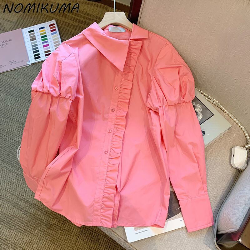 のみくまシックピンクパフスリーブレディースブラウスフリルシングルブレストターンダウンカラーシャツ2022AutumnDe オータム 秋物 kor17882759269