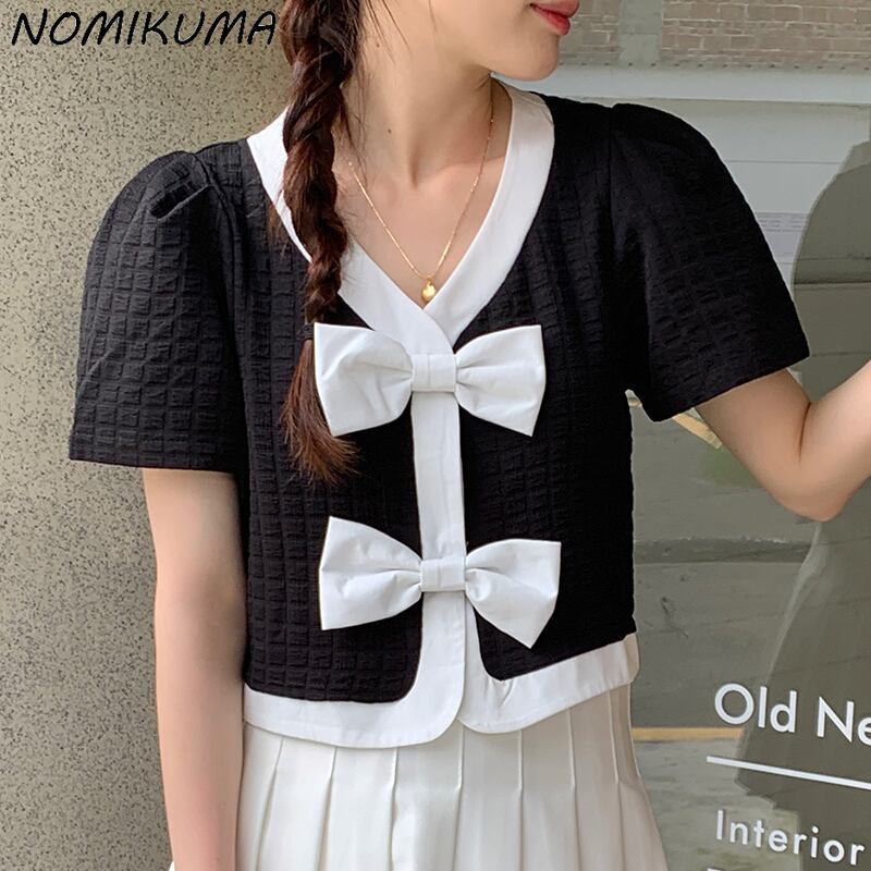 ノミクマシックスウィートヒットカラーボウノットレディースシャツサマーパフスリーブVネックブラウストップスCausal2022De リボン 大人ガーリー キュート カジュアル 夏物 kor98200503259