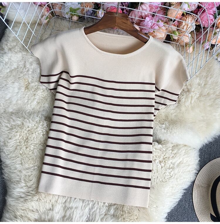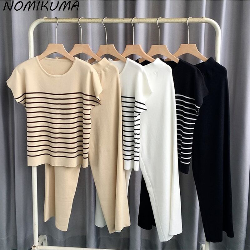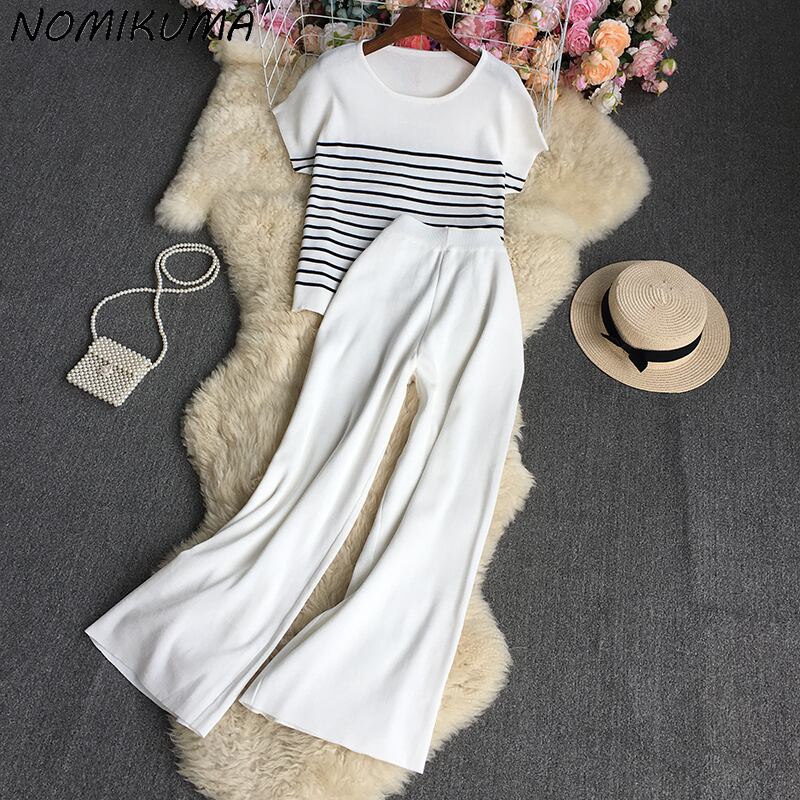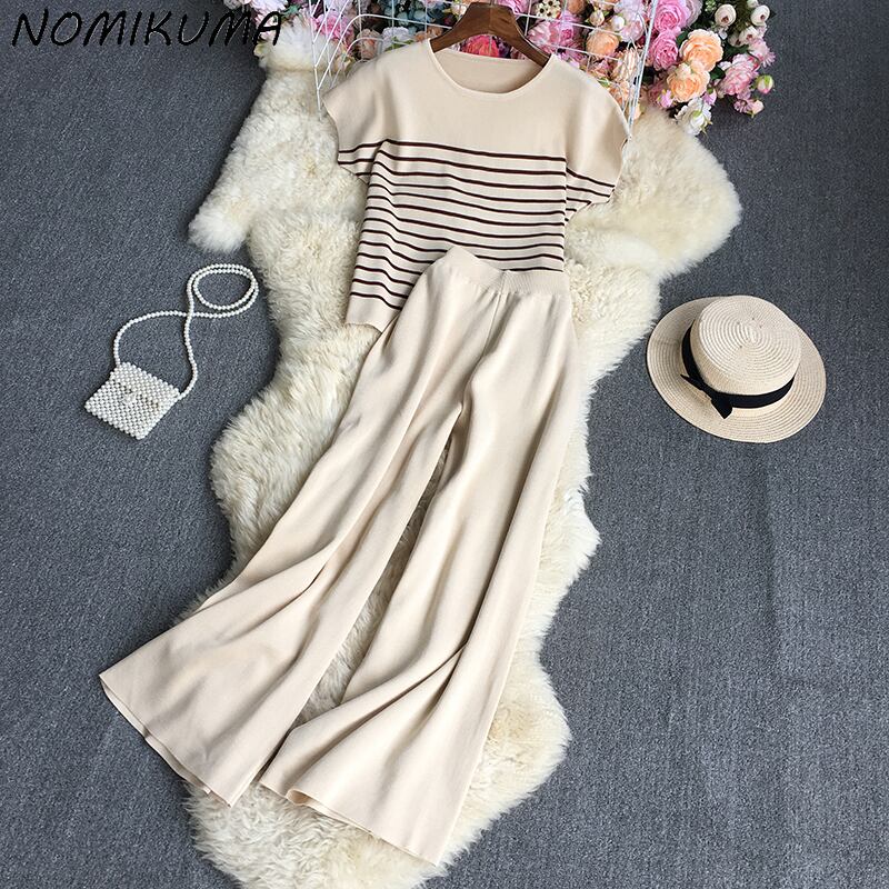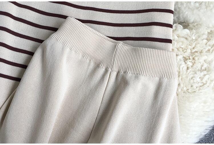 のみくまニットツーピースレディースセット半袖Oネックストライププルオーバーニット+ウエストワイドレッグパンツ2022 ショート ハーフスリーブ ワイドパンツ kor49468365791