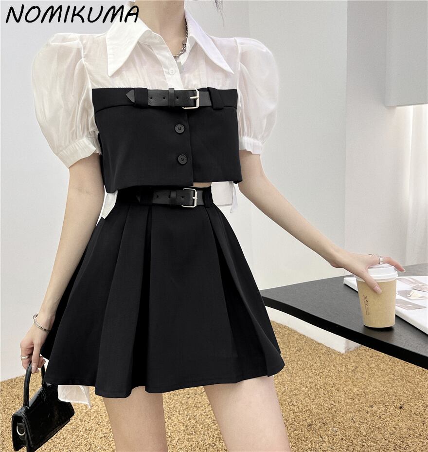 のみくまレディーススーツパフスリーブコントラストカラークロップトップス+tウエストプリーツスカートスタイル2点セット kor36663548545