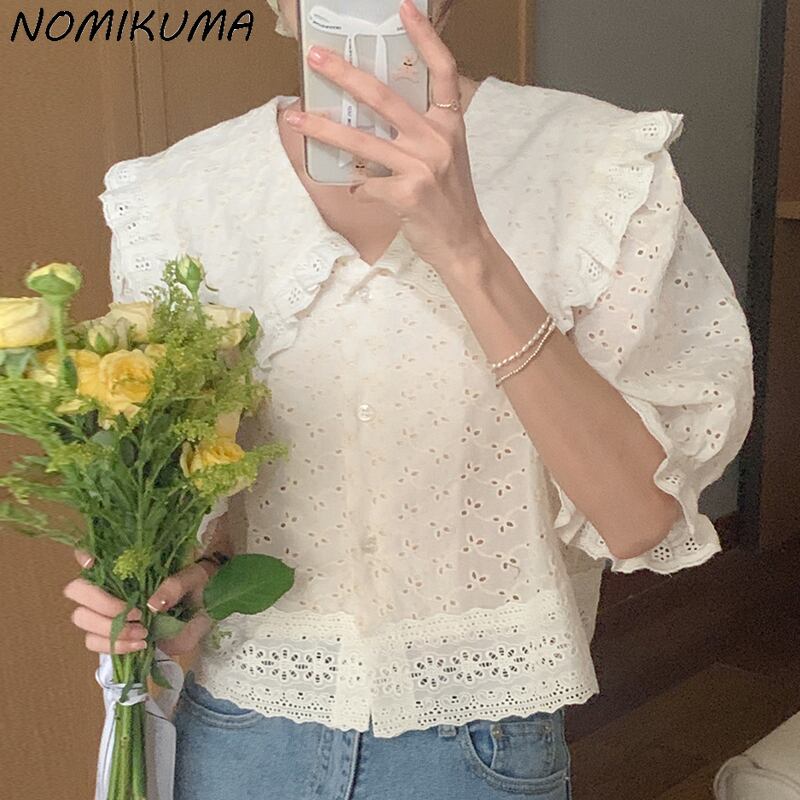 のみくまシックサマーウーマンシャツスウィートレースパッチワークピーターパンカラーブラウストップス2022サマーカミサ 大人ガーリー キュート カジュアル 夏物 kor25601928599