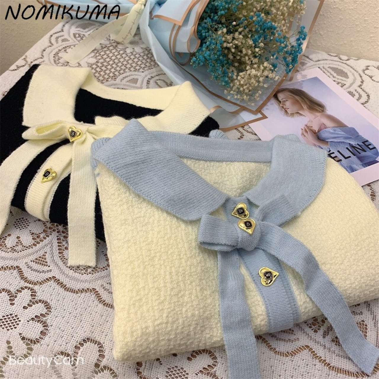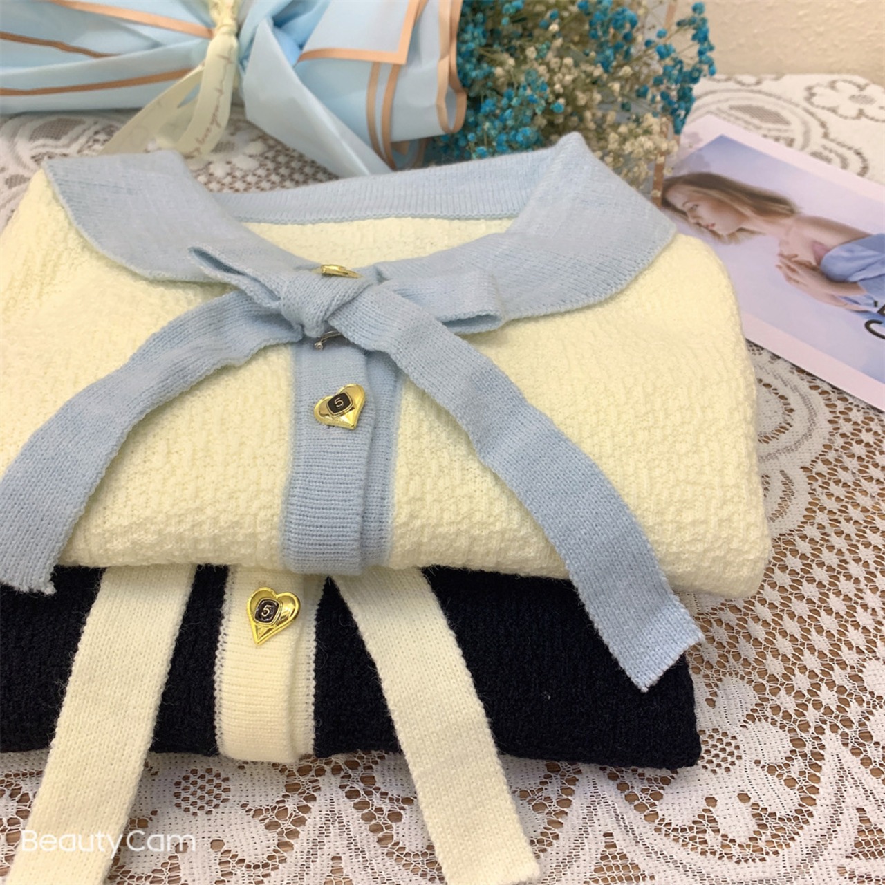 のみくま2022秋のコントラストカラーフリル長袖蝶ネクタイニットレディーススウィートニットセーターカーディガン ロング リボン 大人ガーリー キュート カジュアル オータム 秋物 kor99088469875