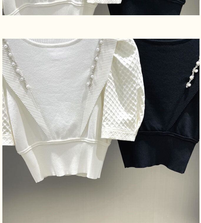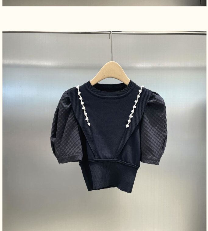 のみくまシックパフスリーブフェイクツーピースニットビーズダイヤモンドOネックプルオーバー2022サマースウィートニットショートトップ 大人ガーリー キュート カジュアル 夏物 kor30934369911