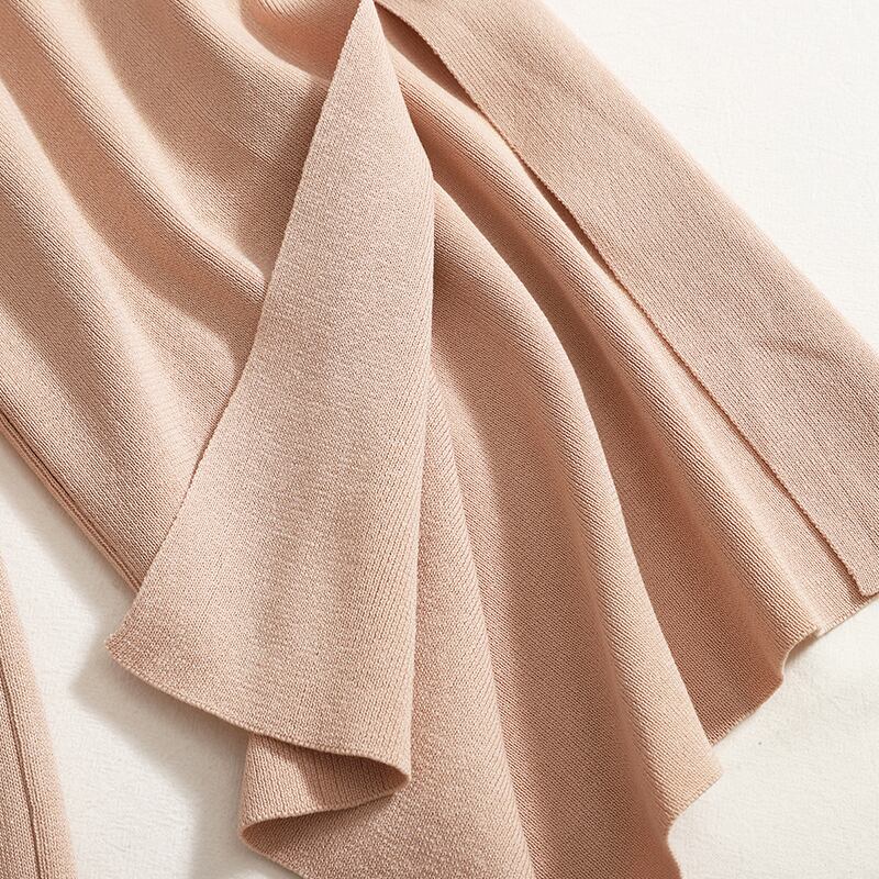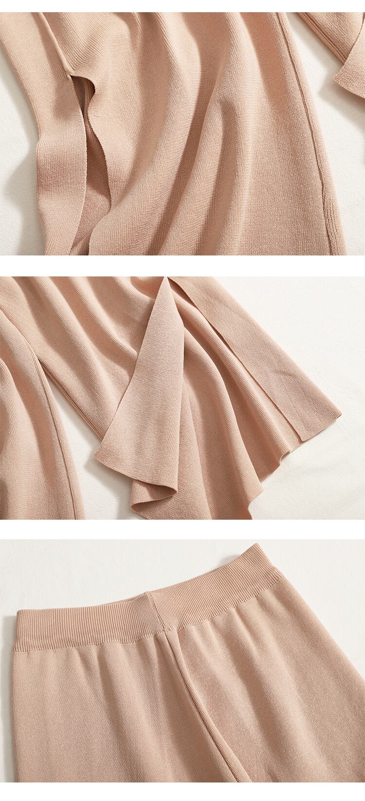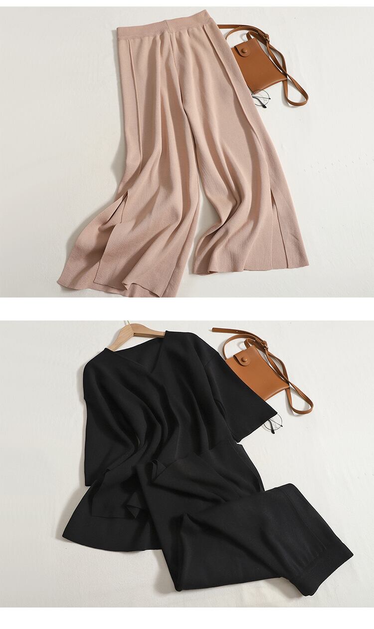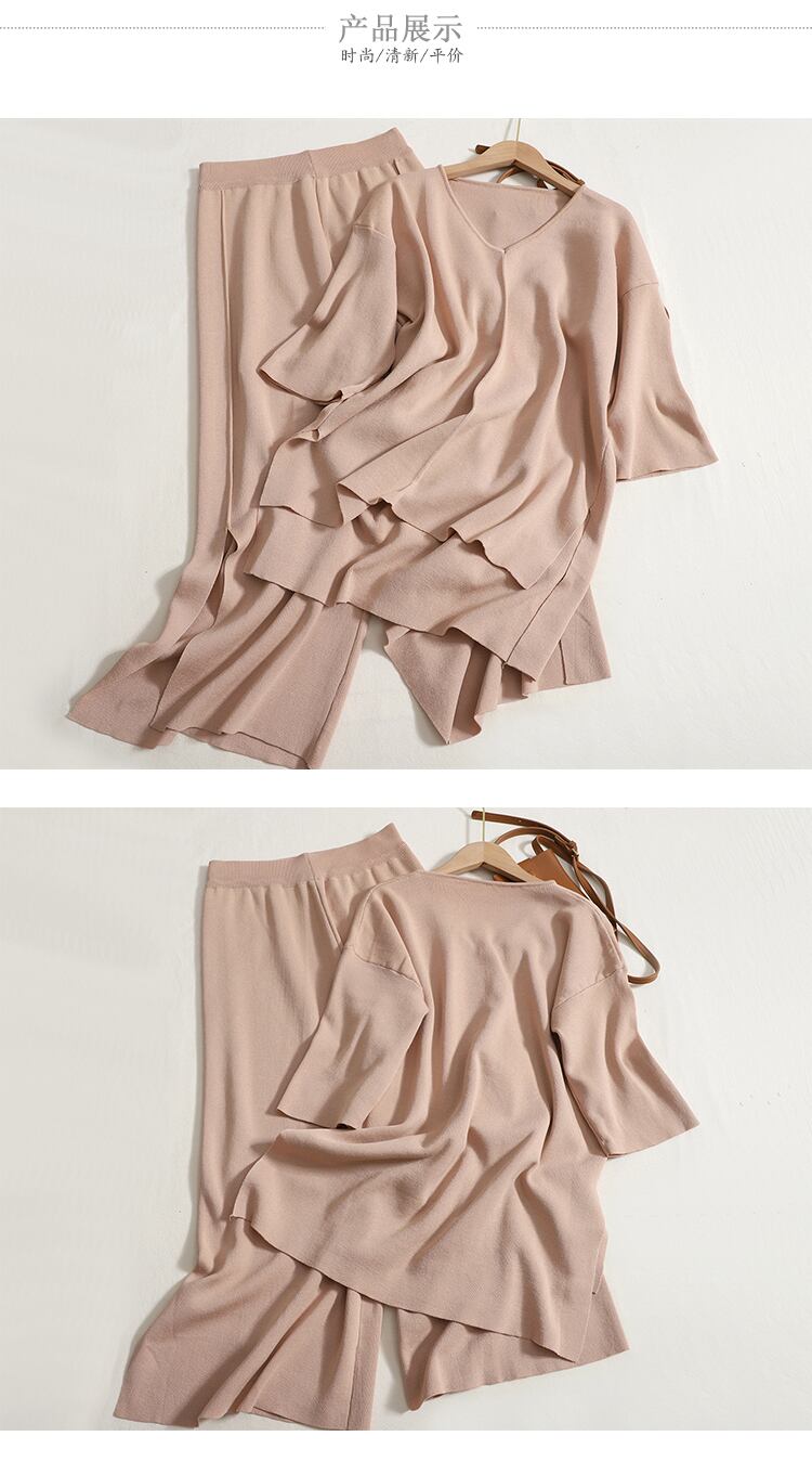 のみくまVネック無地半袖ニットレディース因果ウエストスプリット足首丈ワイドレッグパンツツーピース ハーフスリーブ ワイドパンツ ソリッドカラー kor55909502112
