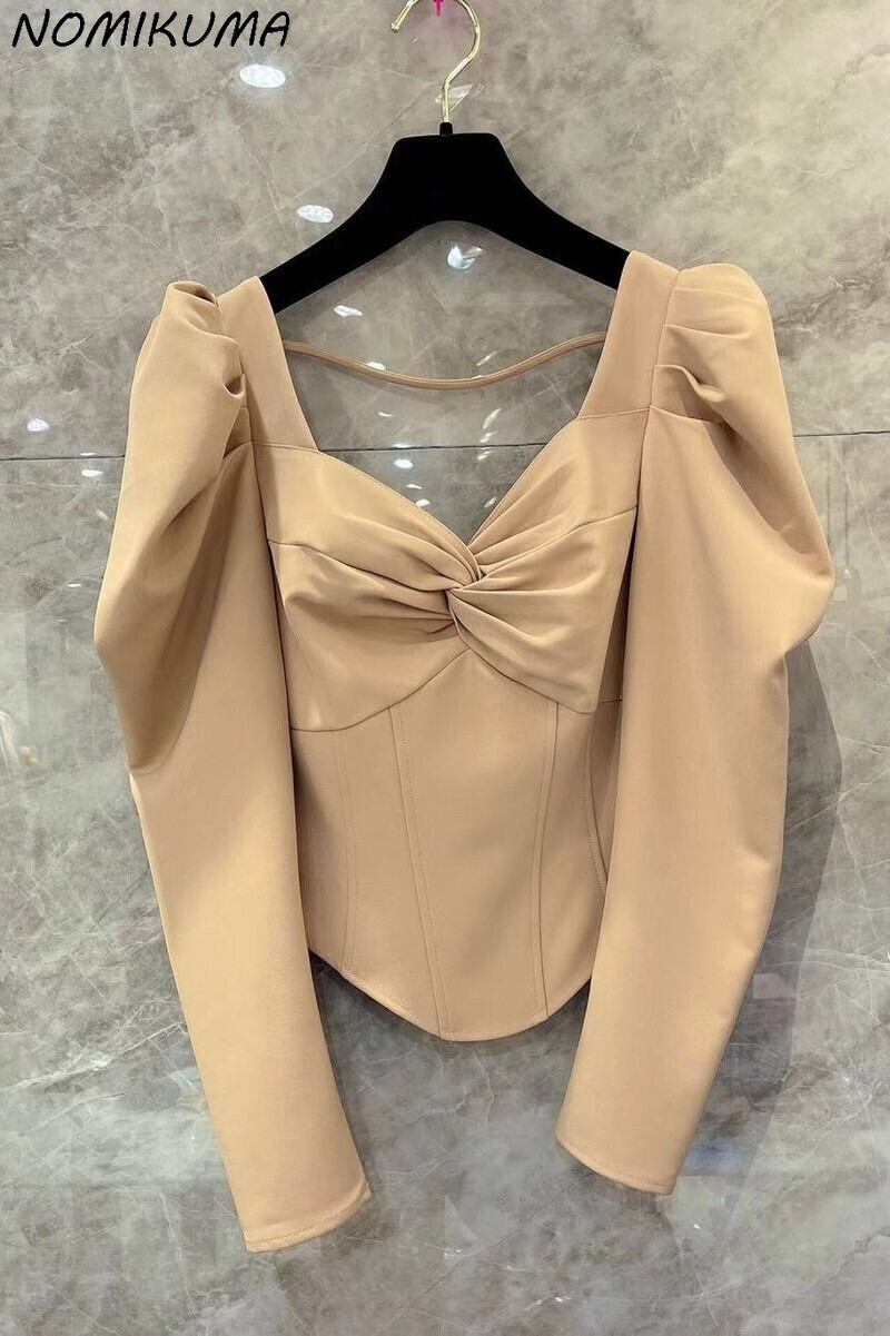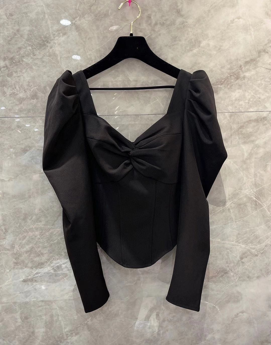 のみくまパフスリーブショートブラウスレディース2022オータムトップススクエアカラーソリッドデモーダ 秋物 ソリッドカラー スクウェア kor52656759789