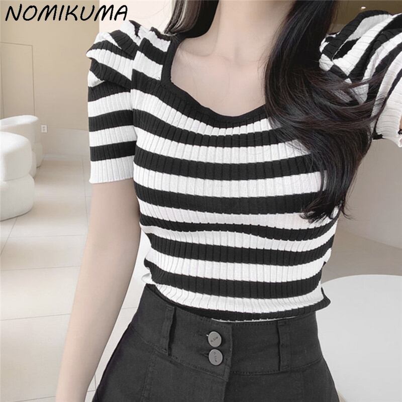 のみくまシックスクエアカラーパフスリーブストライプニット2022夏女性ニットトップスリムプルオーバーセーター サマー 夏物 スクウェア kor68979439579