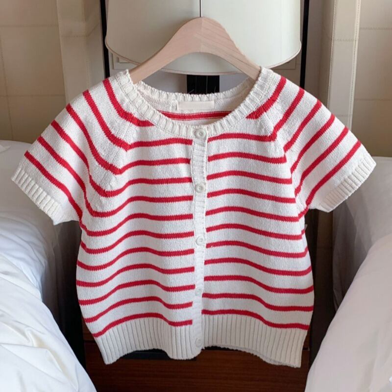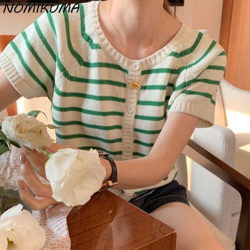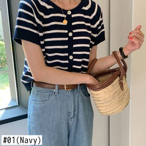 のみくまシック半袖ストライプニットカーディガンレディース2022夏セーターコート因果ニットトップ ショート ハーフスリーブ サマー 夏物 kor28004857628