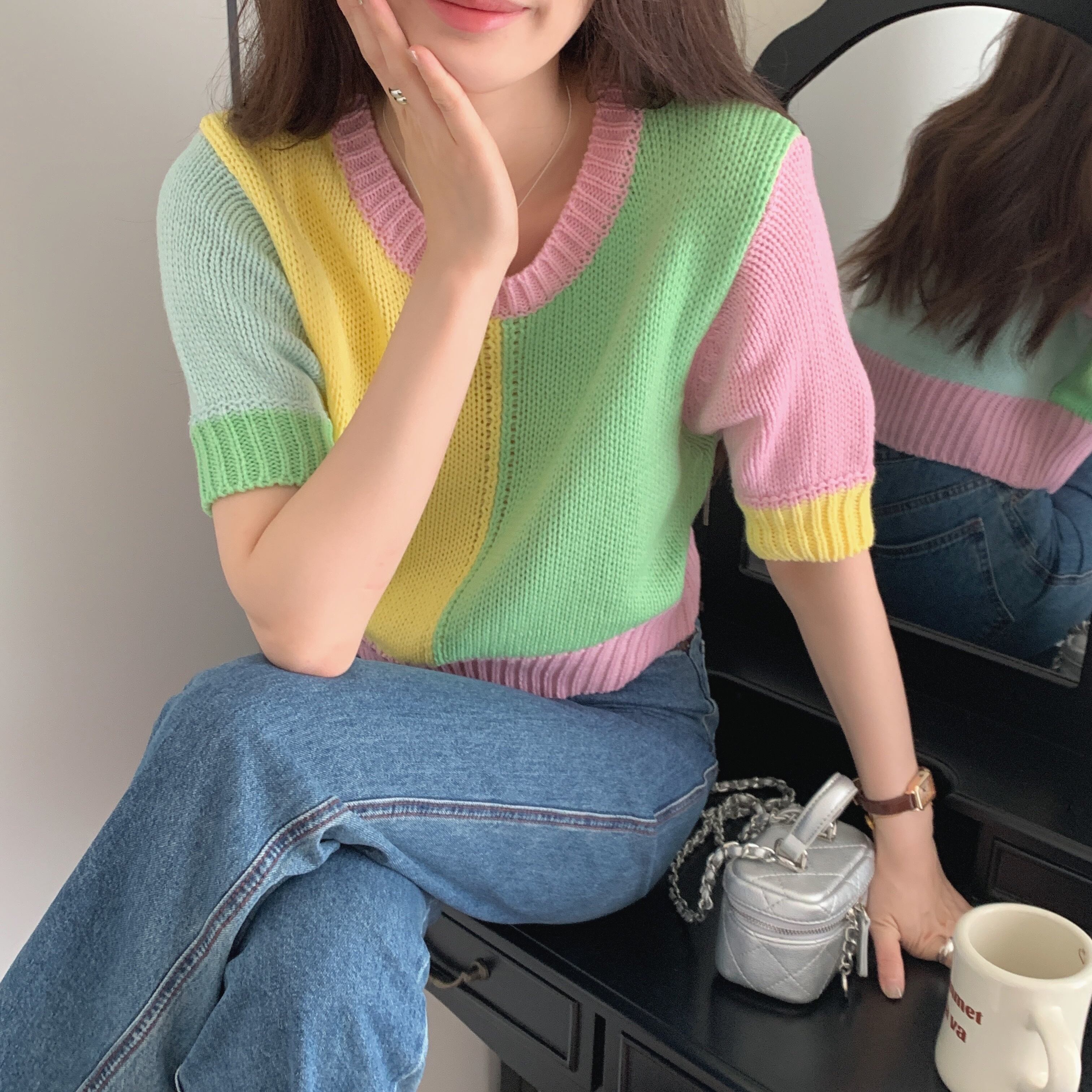 Nomikuma 女性の夏のセーター服コントラストカラープルオーバーニット因果 2022 半袖 O ネックニットトップス ショート ハーフスリーブ サマー 夏物 Oネック kor40745352426