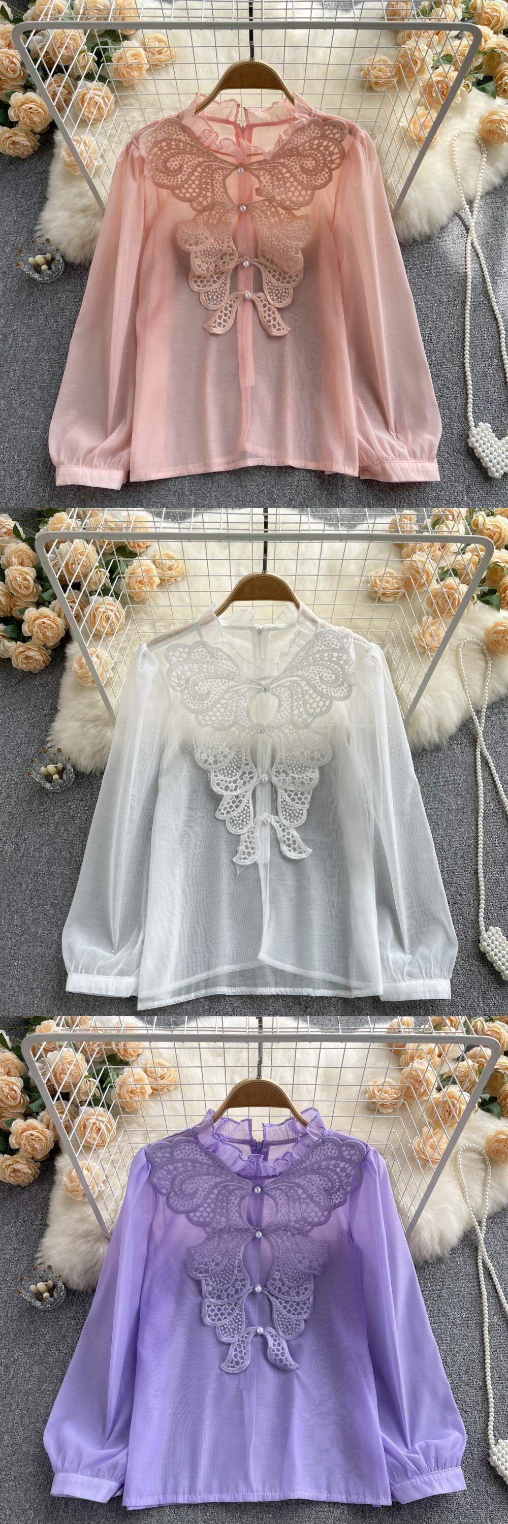 Nomikuma シックな刺繍甘いフリル スタンド ネック レディース トップス シフォン パフ スリーブ プルオーバー ブラウス 2022 大人ガーリー スウィート キュート カジュアル kor25968463061