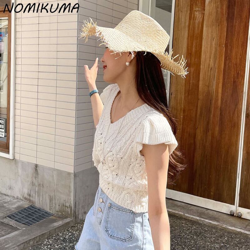 Nomikuma 女性フライングスリーブ V ネックニット夏トップスソリッドスタイルレディースニットツイストプルオーバーシックなセーター サマー 夏物 Vネック ソリッドカラー kor58619415052