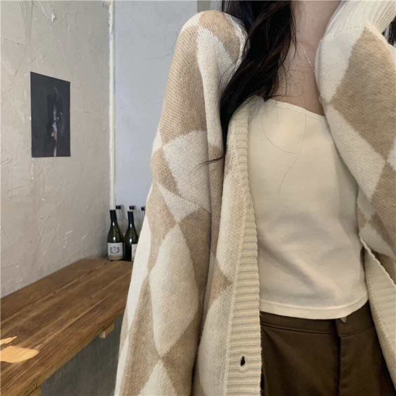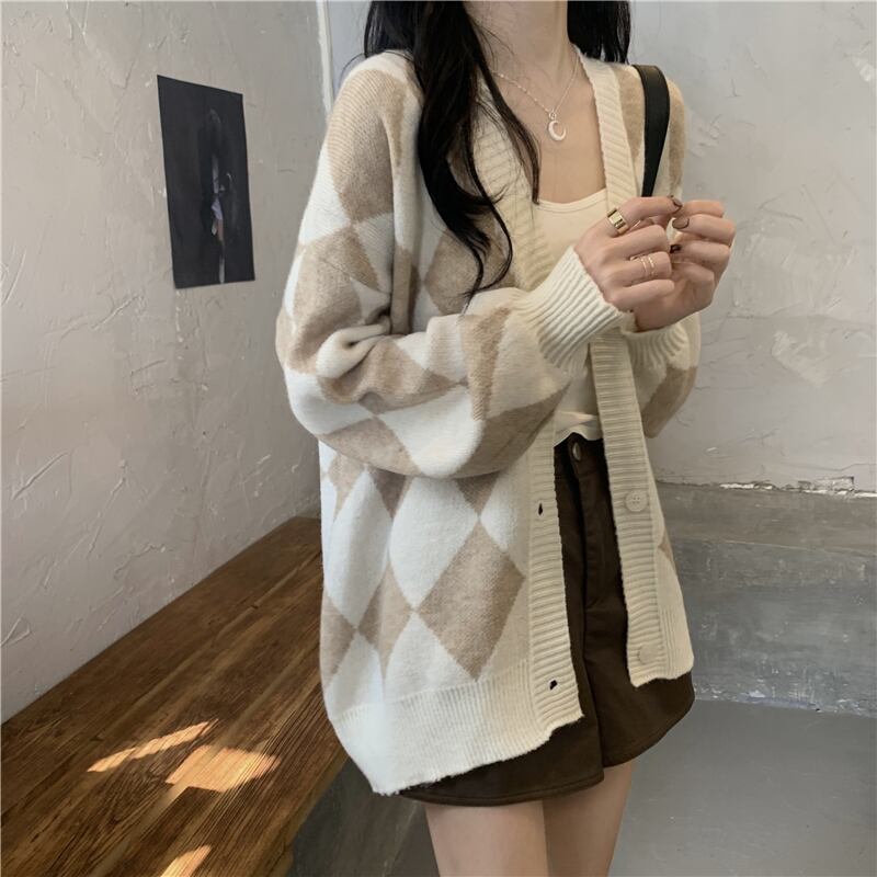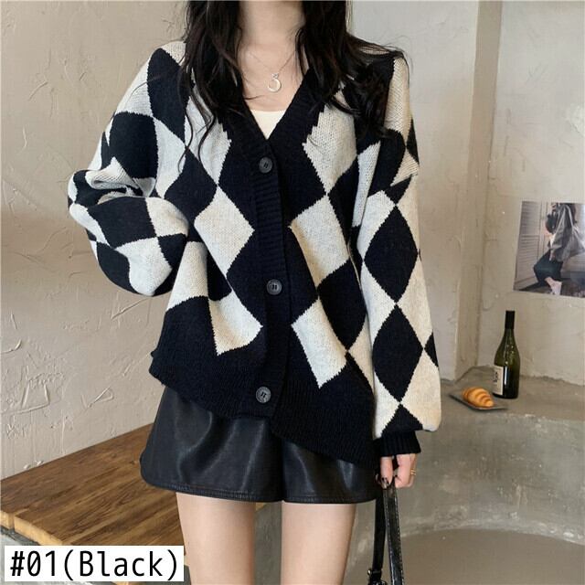 Nomikuma V ネックシングルブレストニットカーディガントップス 2022 秋のヒットカラーアーガイル因果女性セーターコート オータム 秋物 Vネック kor76109401134