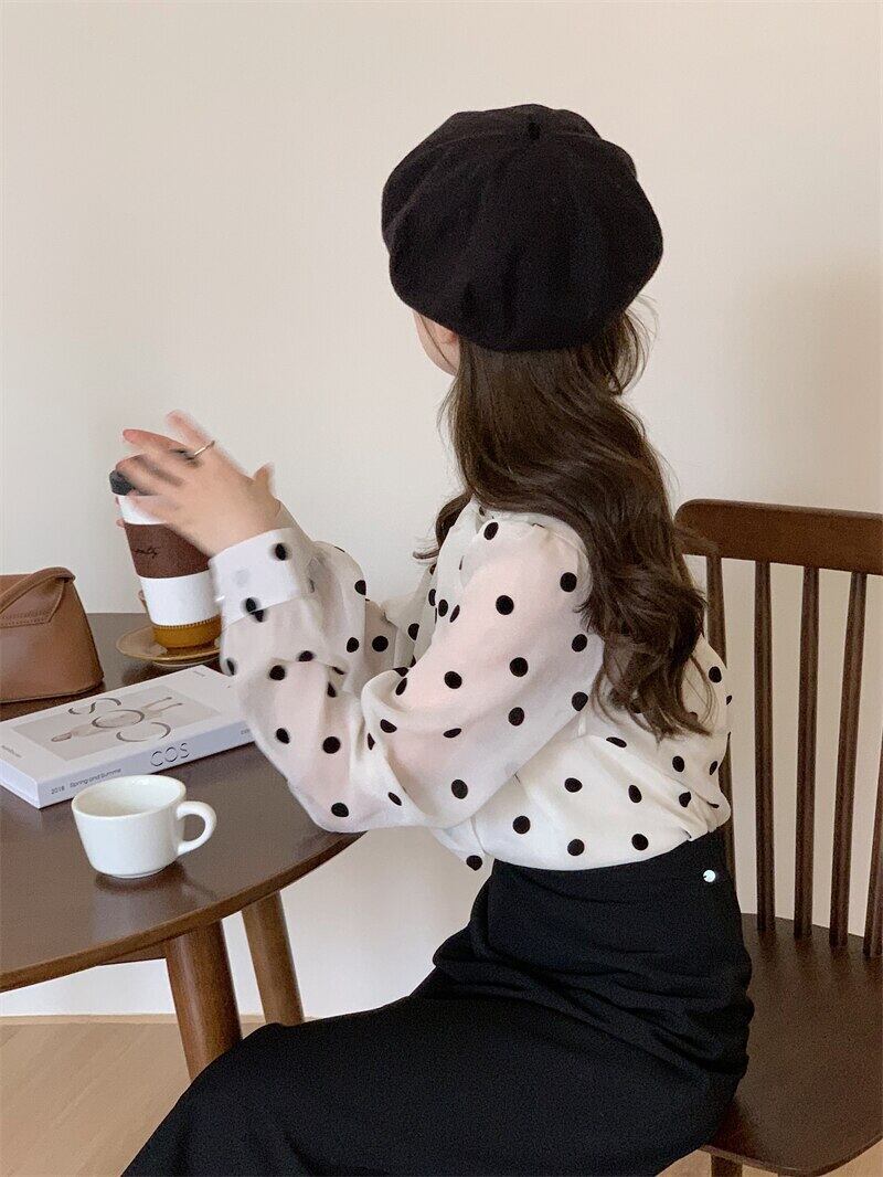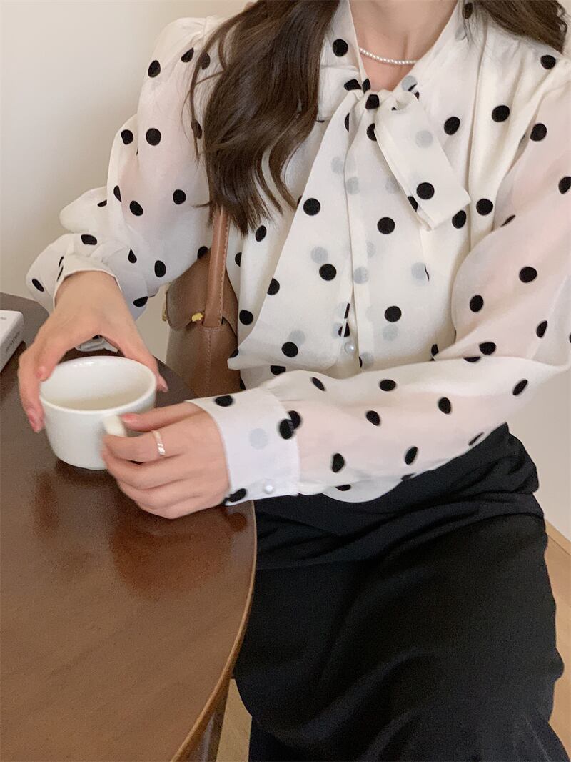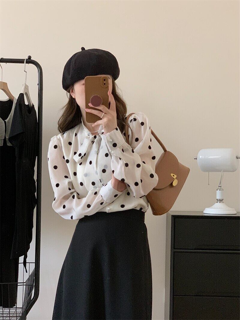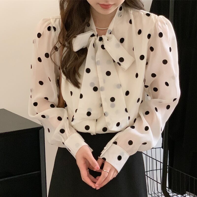 草引水玉ブラウストップス因果パフスリーブ蝶ネクタイ秋の女性シャツ 2022 シック Feminimos リボン オータム 秋物 kor73096471218