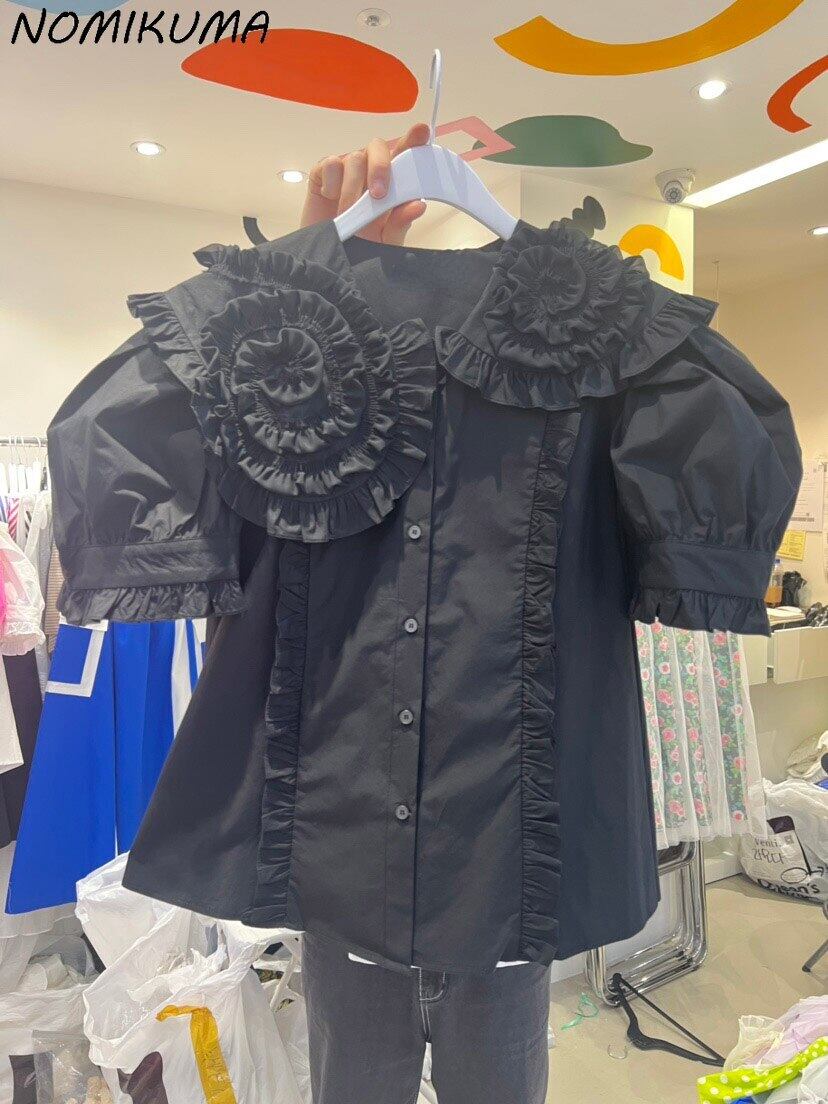 Nomikuma シックな 3D 花ピーターパン襟ブラウストップス 2022 夏無地フリルパフスリーブ女性シャツ サマー 夏物 ソリッドカラー フラワーデザイン kor40848284363