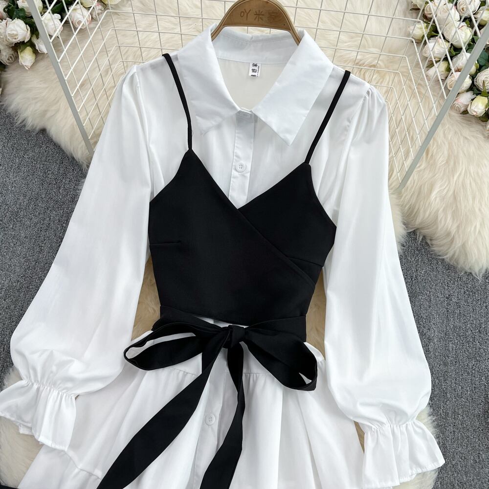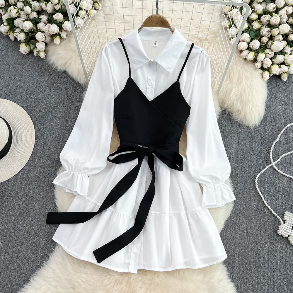 Nomikuma 2022 秋のレディース 2 点セット長袖無地ブラウスドレス + 弓包帯スリムショートスリングベスト衣装 ロング リボン オータム 秋物 ソリッドカラー kor72926279409