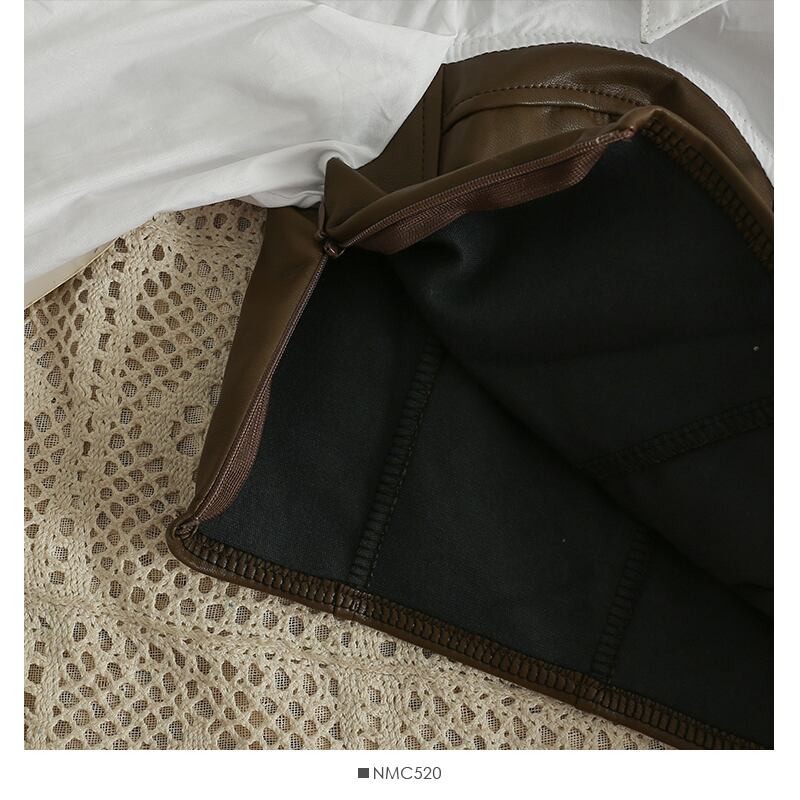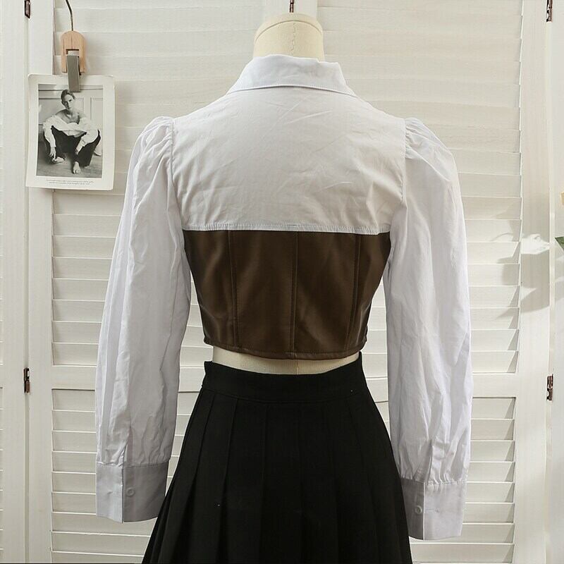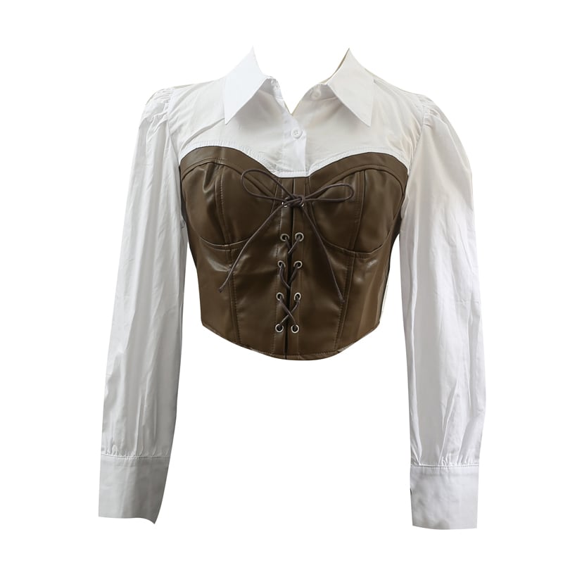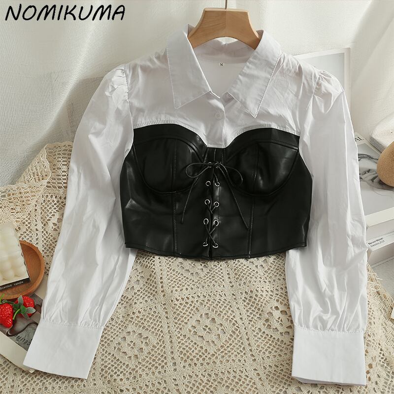 Nomikuma ヒットカラー PU レザーパッチワーク女性ブラウスレースアップウエストクロップトップス 2022 秋の長袖シャツ ロング オータム 秋物 kor48262229920