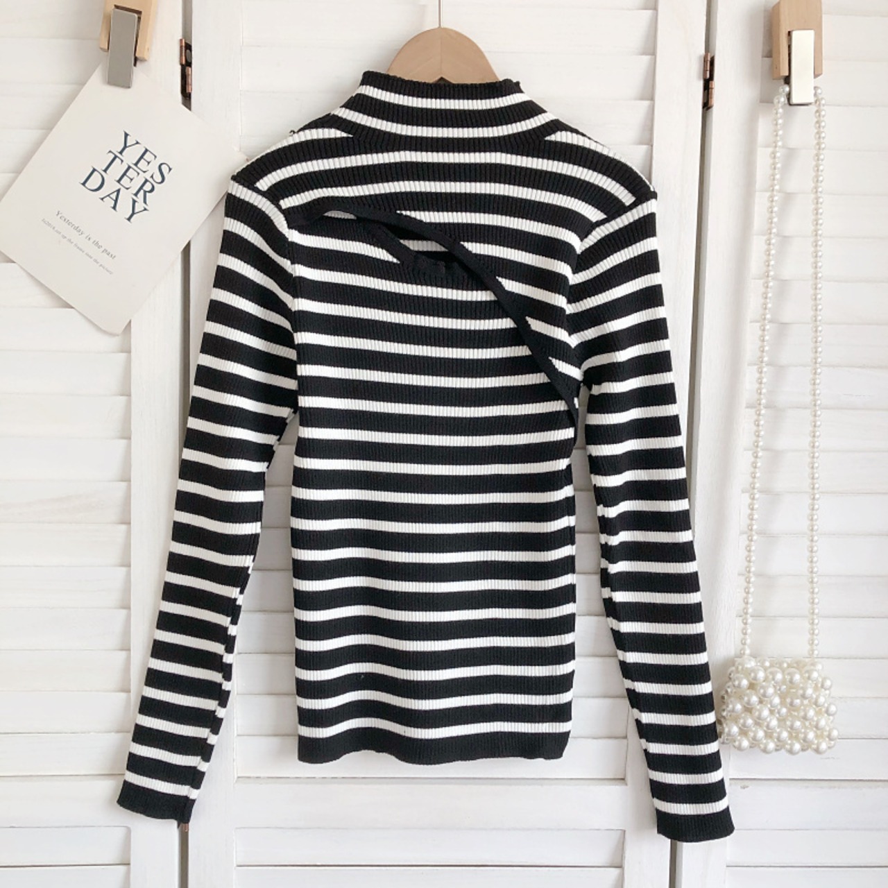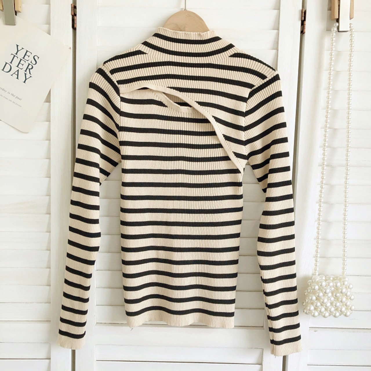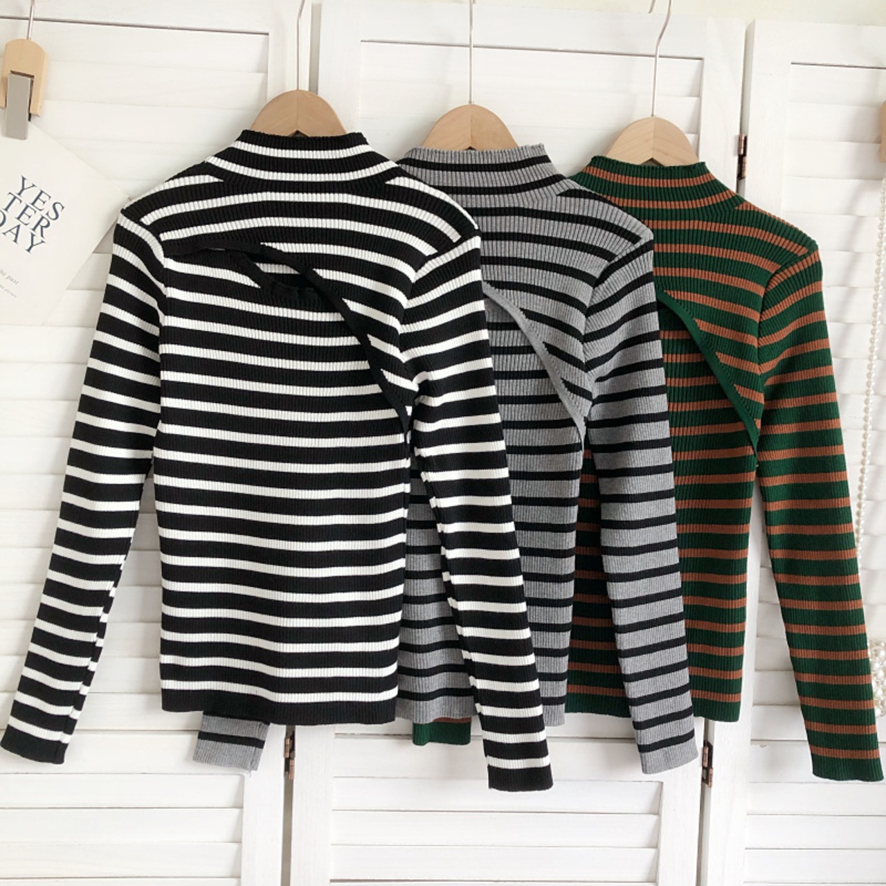 ノミクマ 秋冬 ストライプ ニット ベーシックセーター セクシー くりぬき 半衿 長袖 スリム ニット ロング オータム 秋物 ウィンター 冬物 kor35373437184