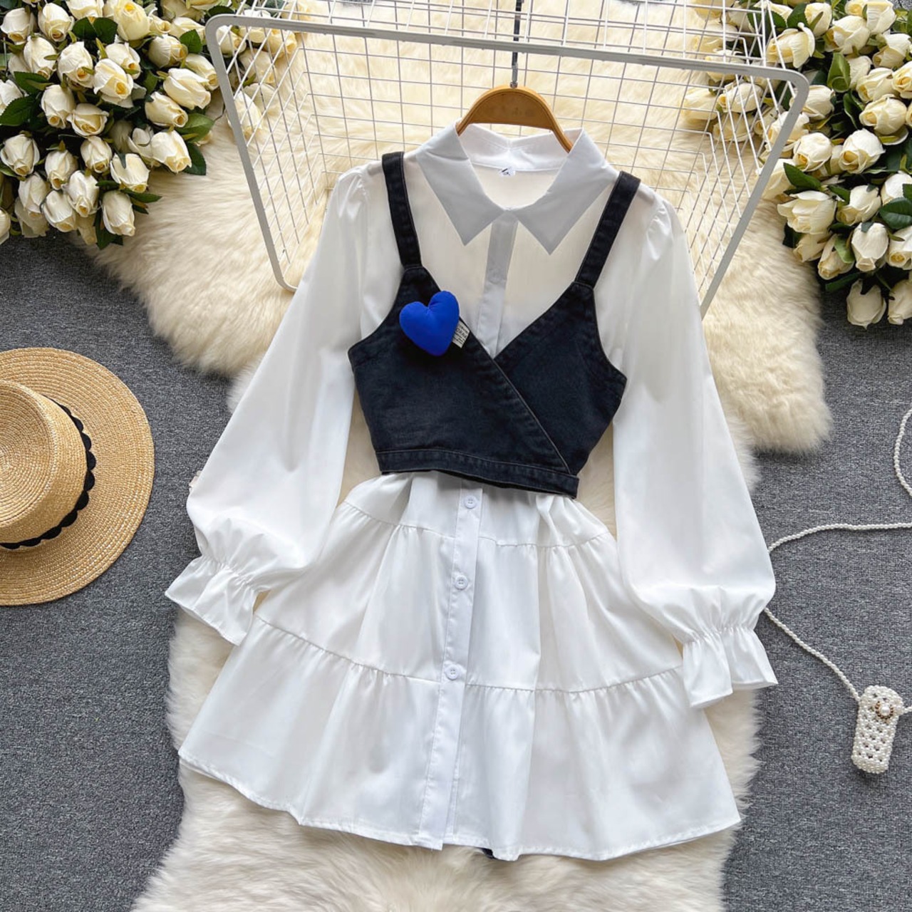Nomikuma 2 ピース女性セット長袖ターンダウン襟ブラウスドレス + 徳民包帯スリムウエストスリングベスト 2 ピース ロング kor82881886775