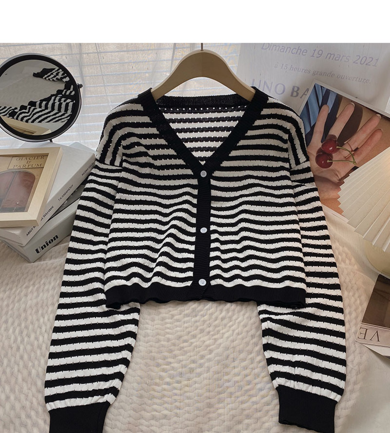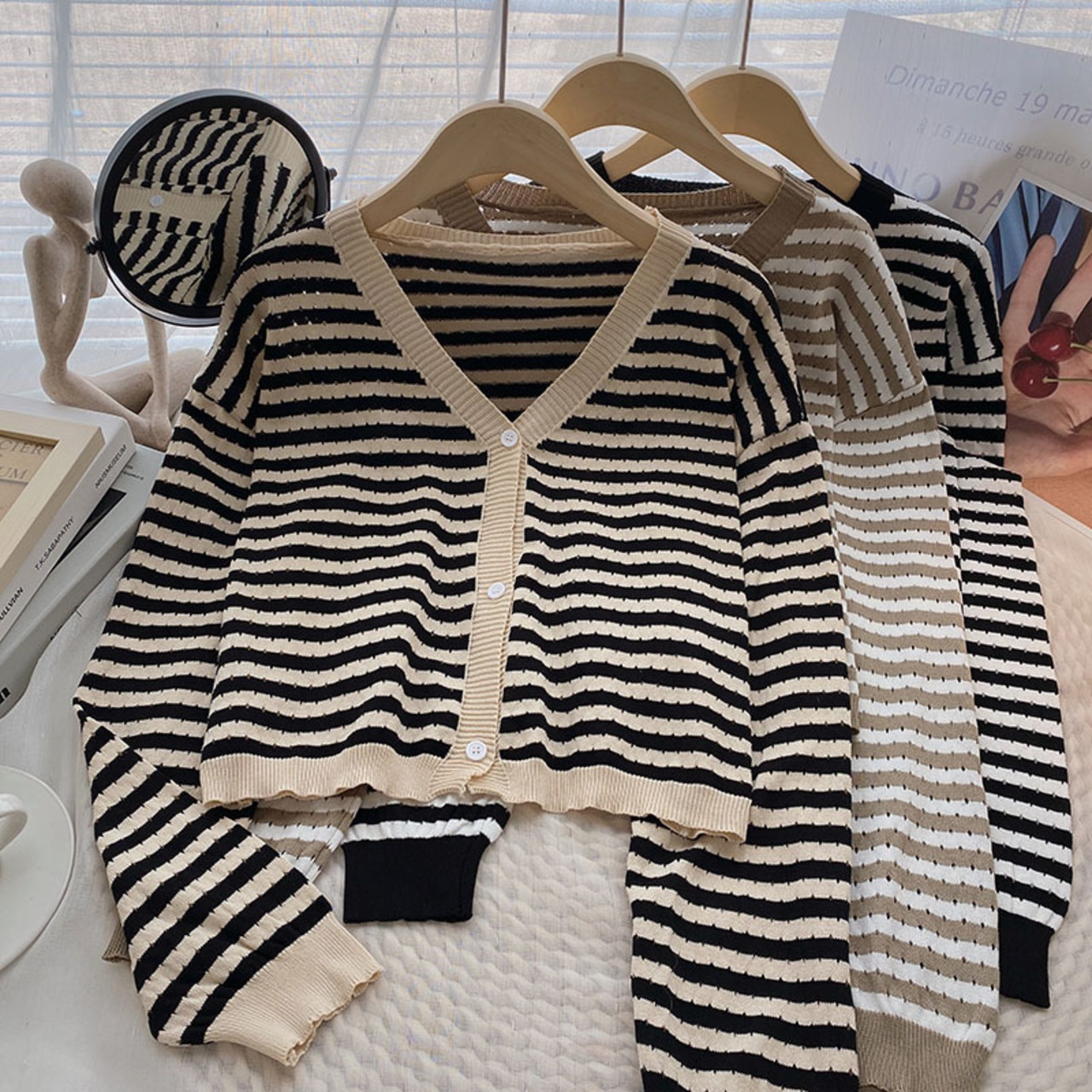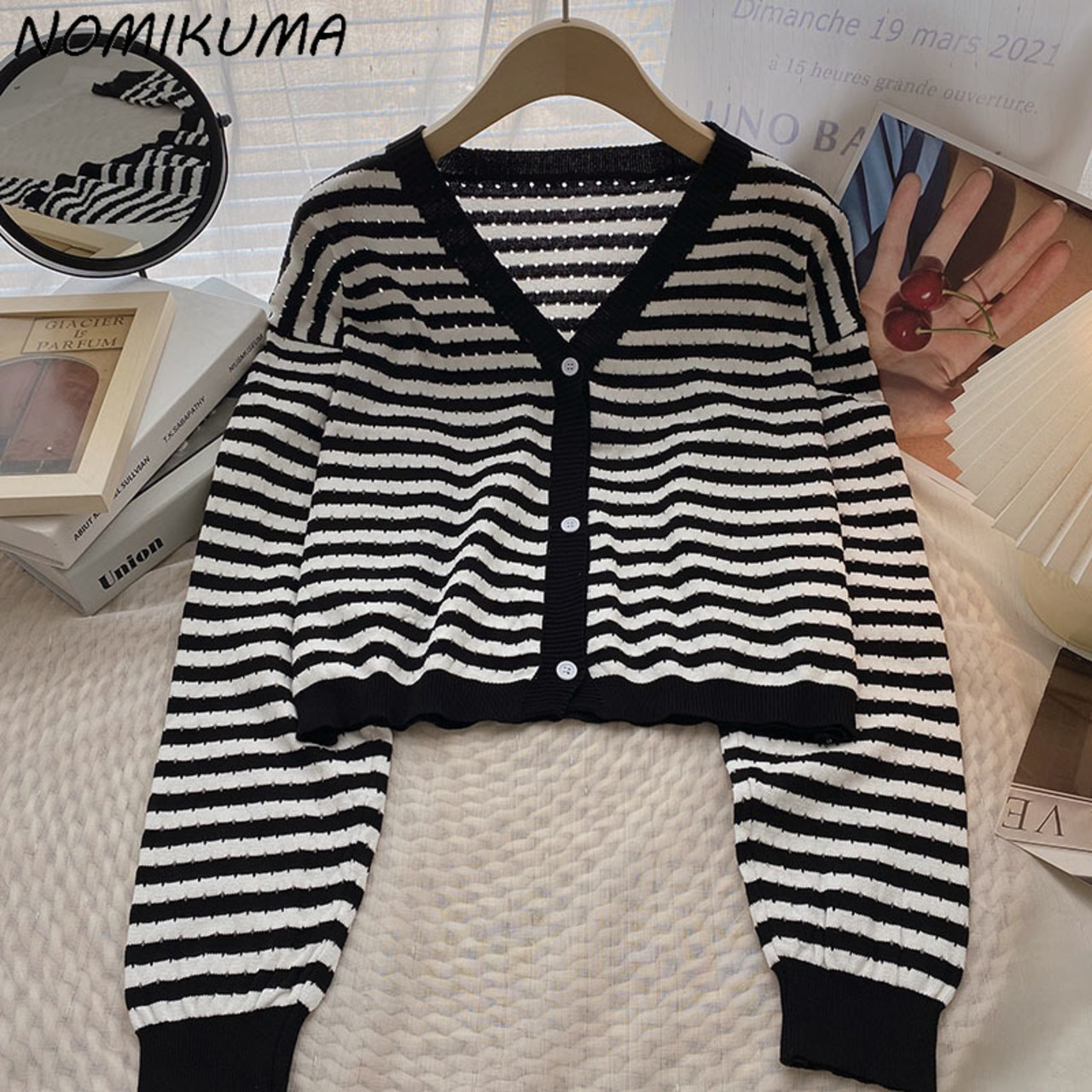Nomikuma 2022 秋ストライプニットカーディガン因果長袖 V ネックショートニットショート女性セーターコート ロング オータム 秋物 Vネック kor46764586277